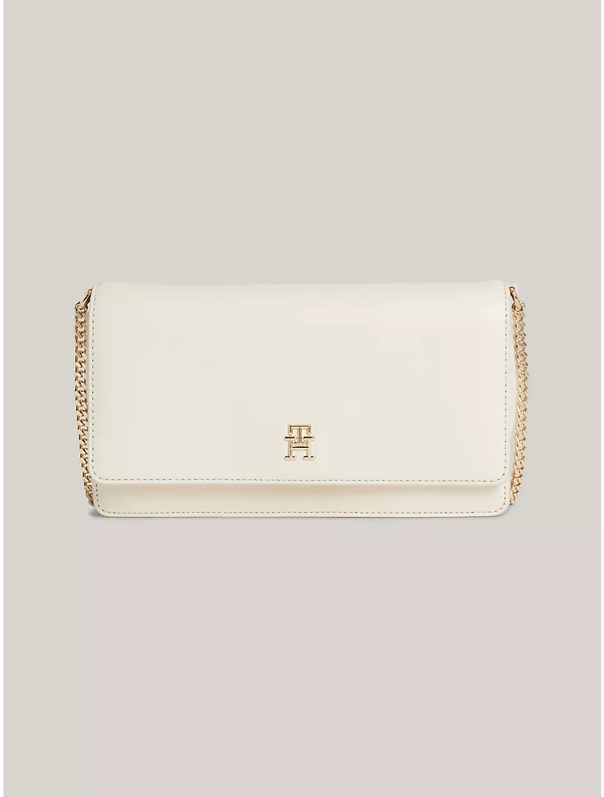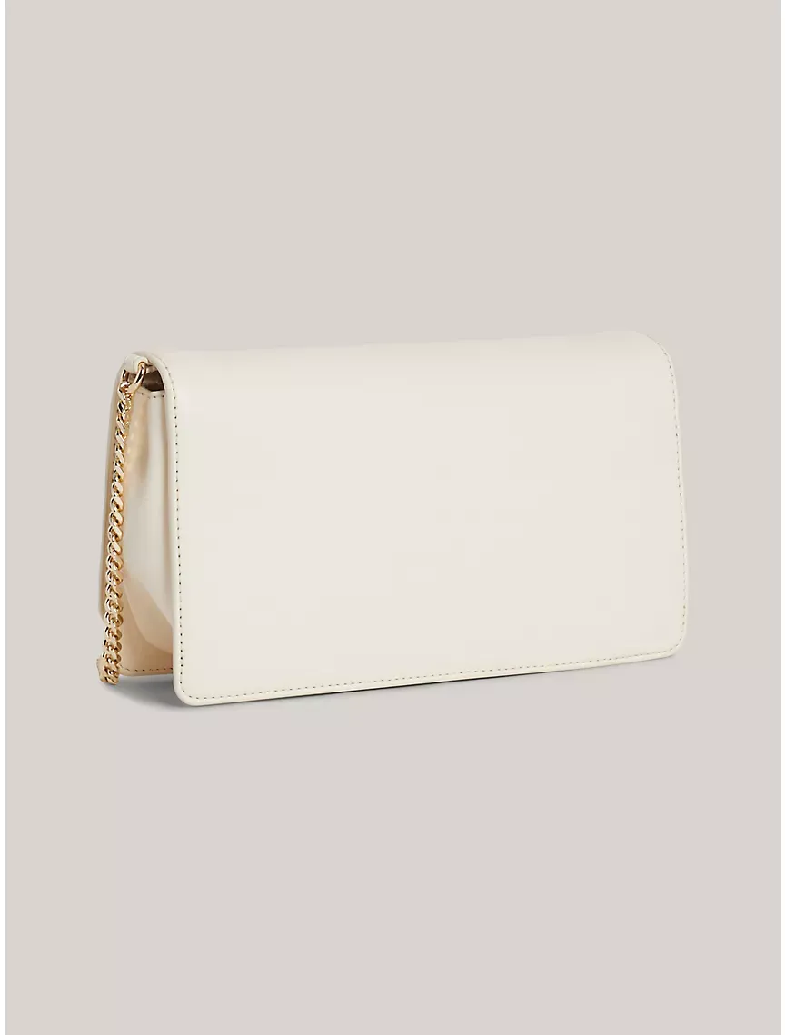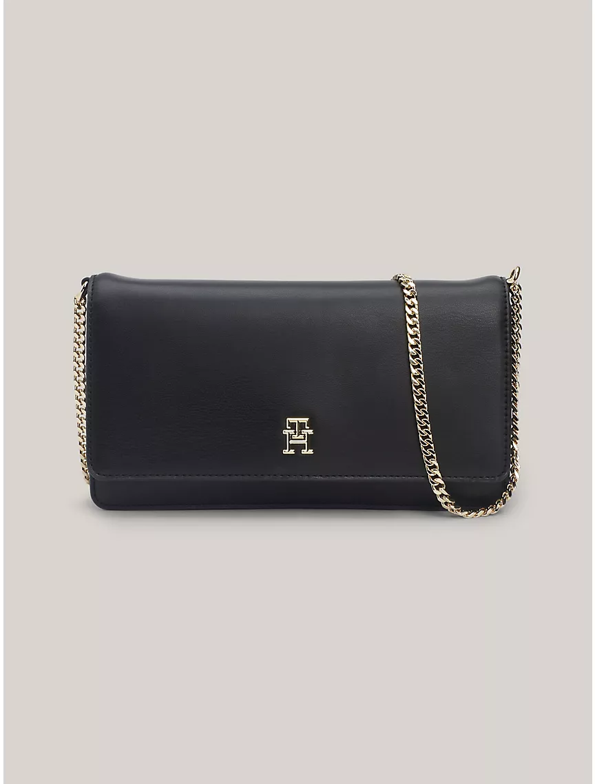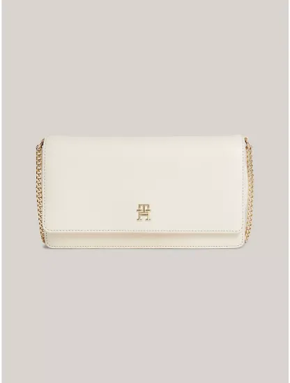 - Flap with snap-button closure, adjustable chain crossbody strap.