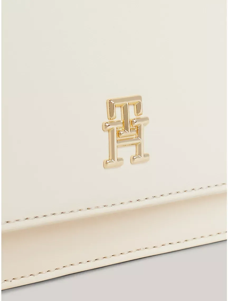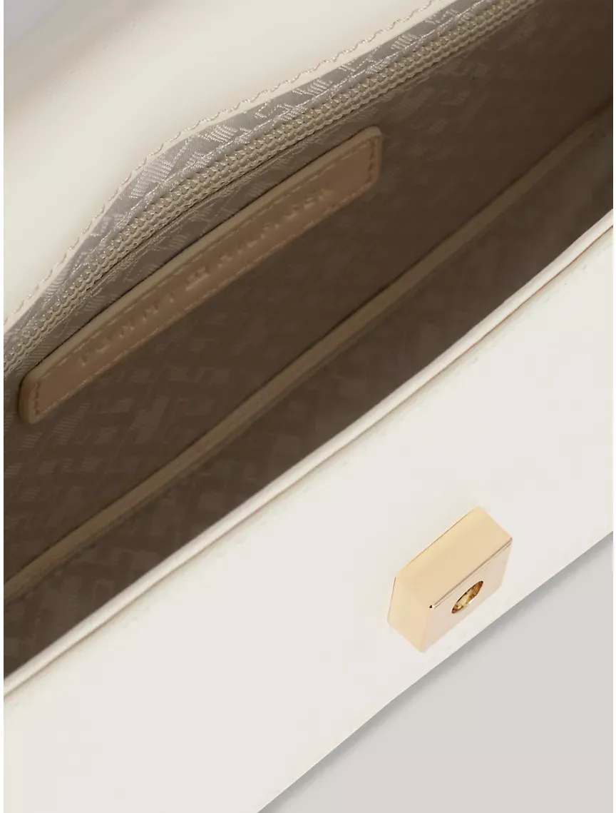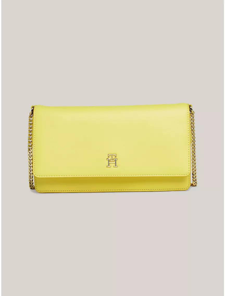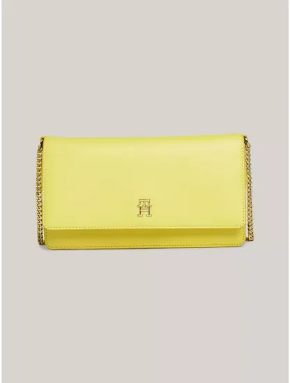 - Flap with snap-button closure, adjustable chain crossbody strap.