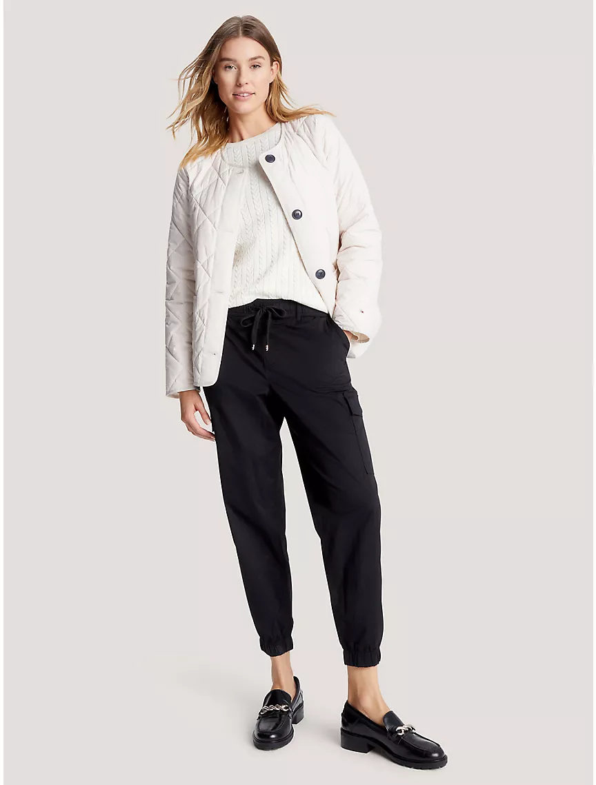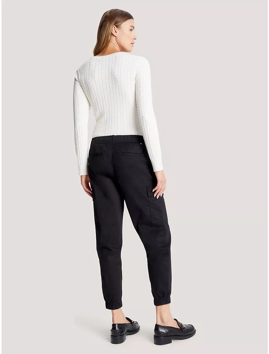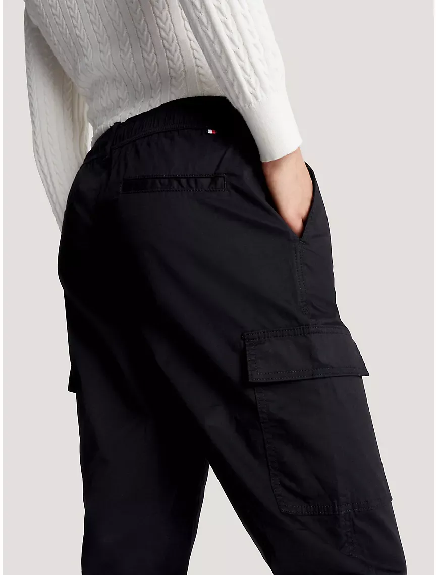 - Elastic drawstring waist, high waist, side slash pockets, back welt pockets, cargo pockets at the legs, elastic cuffs.