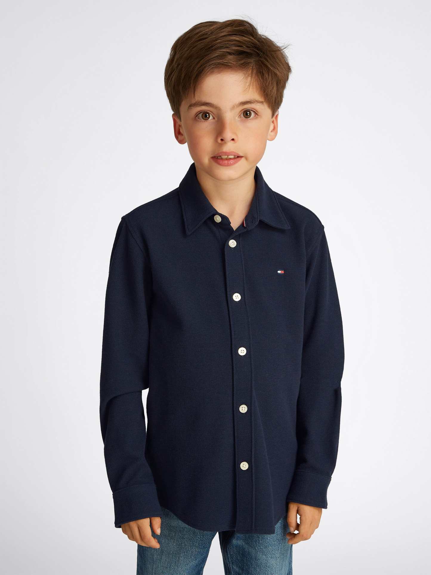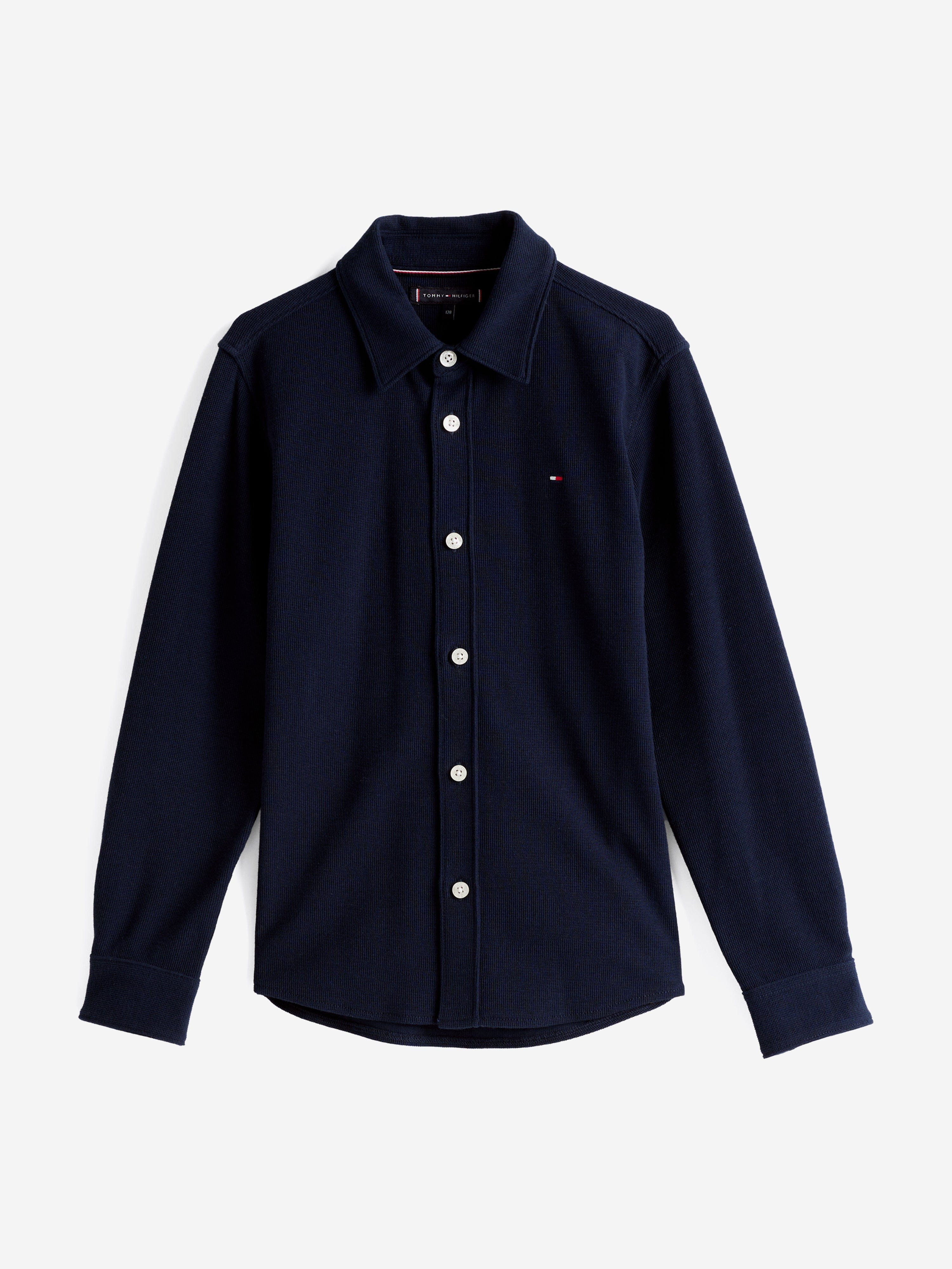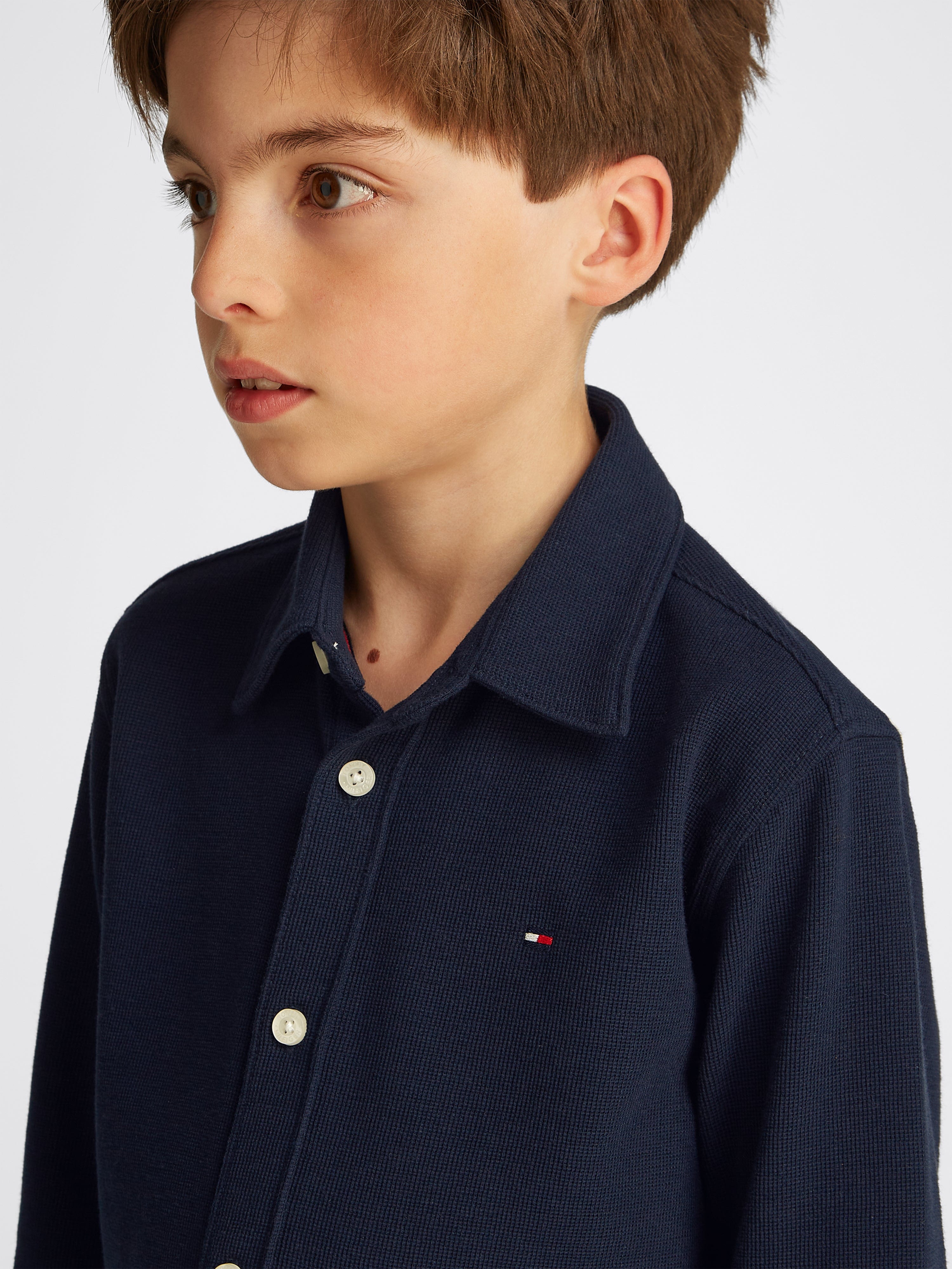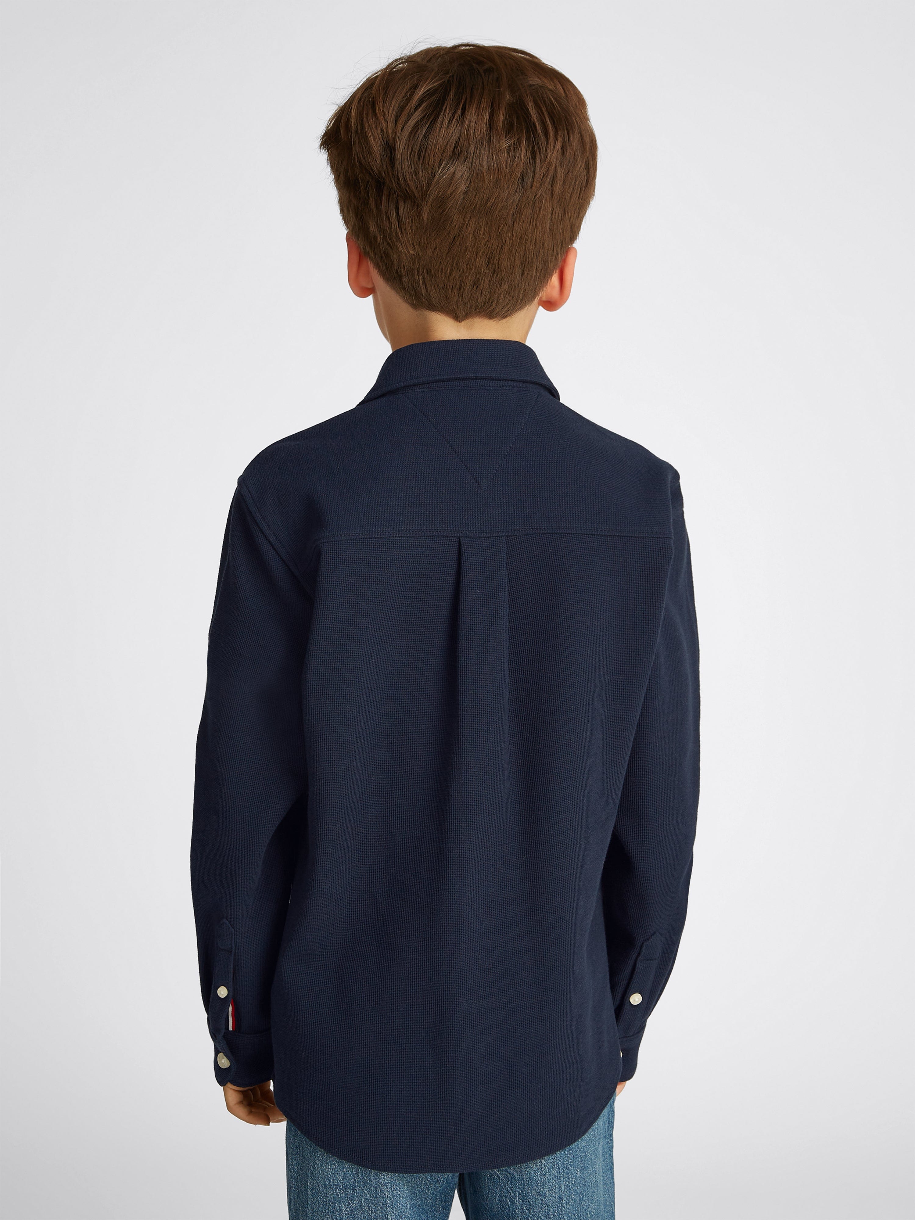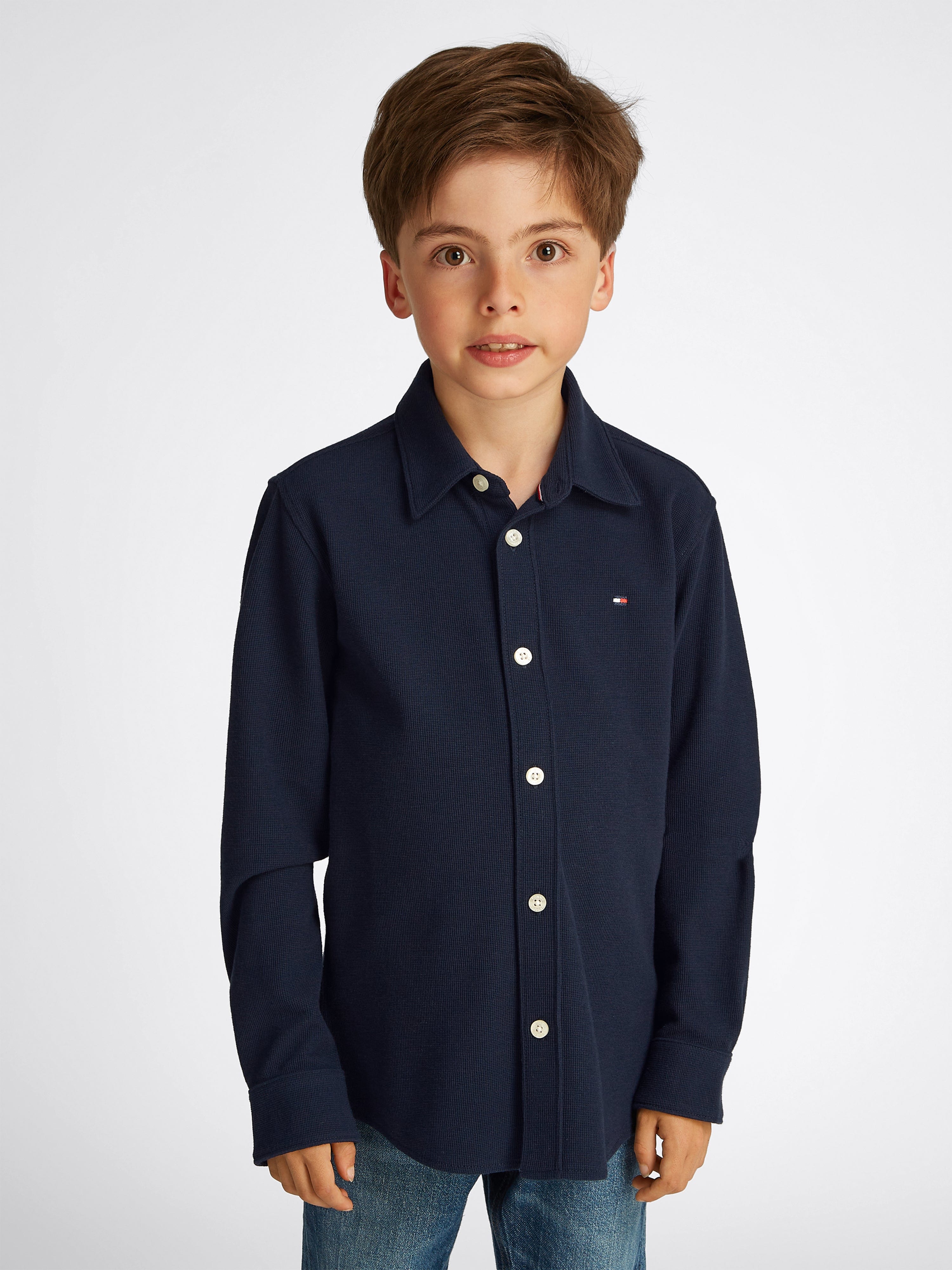 Discover the Boys Micro Waffle Regular Shirt in Navy by Tommy Hilfiger, an impeccable addition to your boy's wardrobe for SS2025. Elegantly designed, this piece merges classic style with contemporary touches. Key features include: