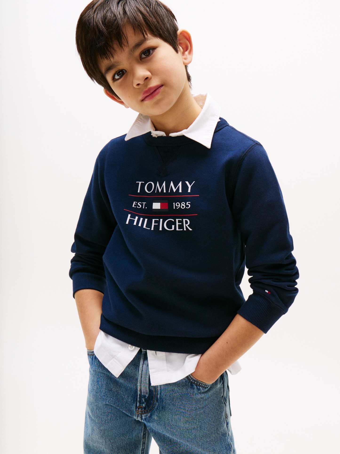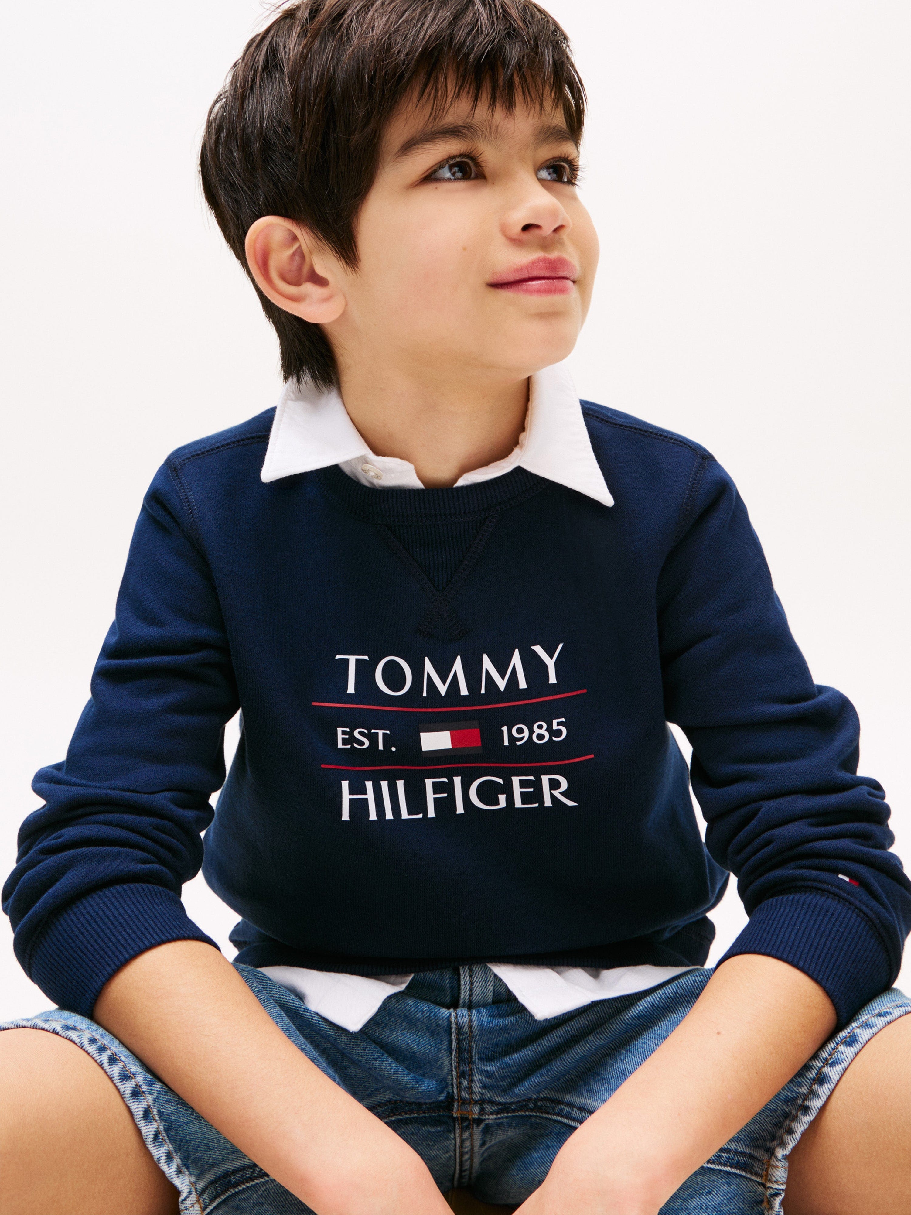 Elevate your young gentleman's ensemble with the Tommy Hilfiger Boys Tommy Flag Sweatshirt in a classic navy hue. Perfect for SS2025, this sophisticated piece blends timeless elegance with a touch of playfulness.