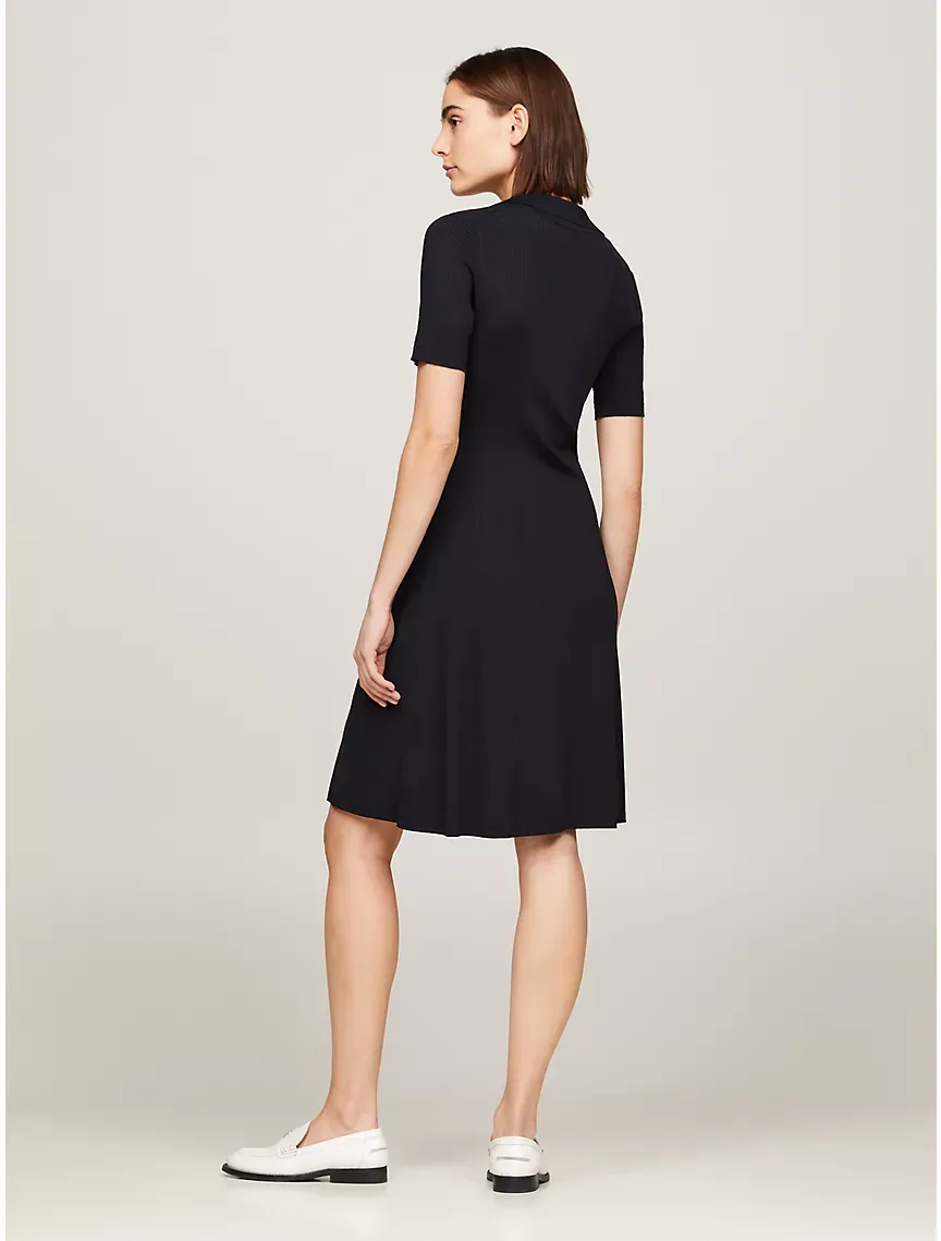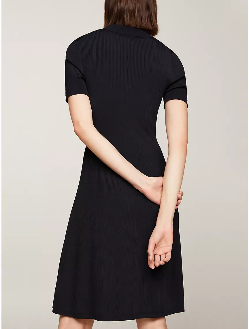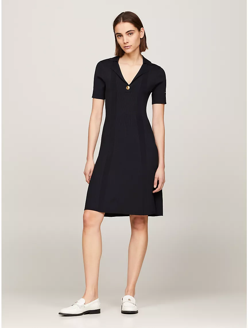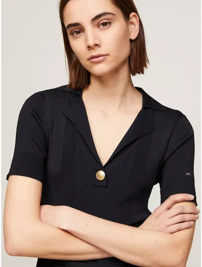 - Polo collar, short sleeves, V-neck, gold TH crest branded button, microflag at sleeve, falls to knee.