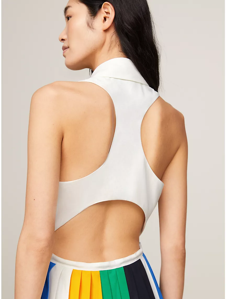 - Drawstring waist, allover pleating, cutout at back.