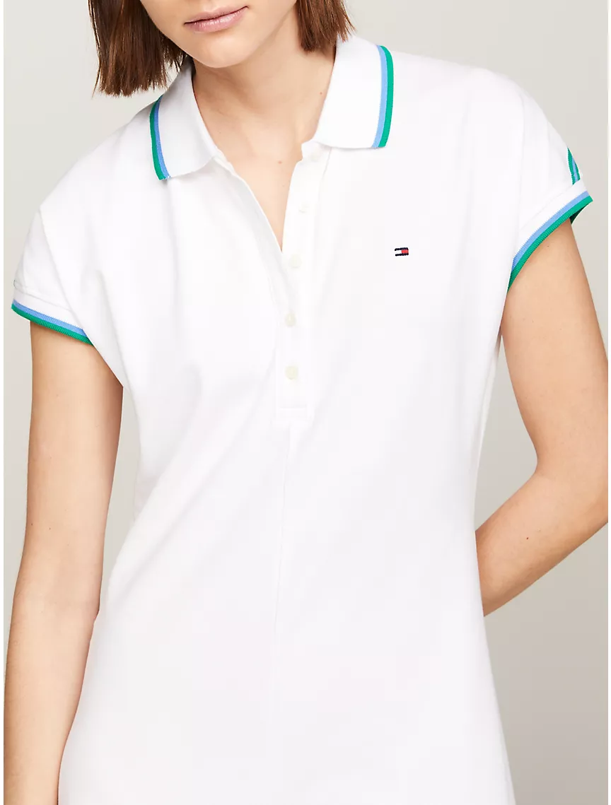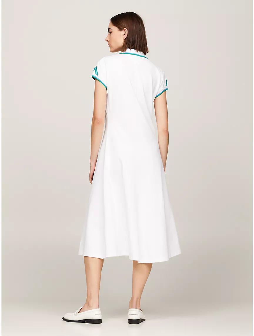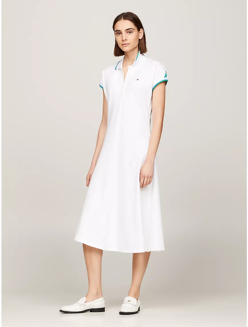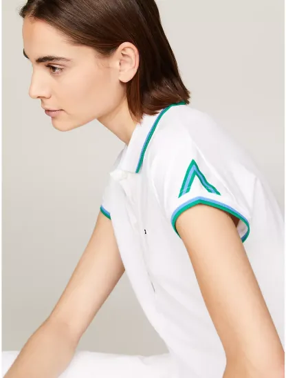 - 5-button placket, tipped collar and cuffs, signature triangle at collar and sleeves, falls to knee.