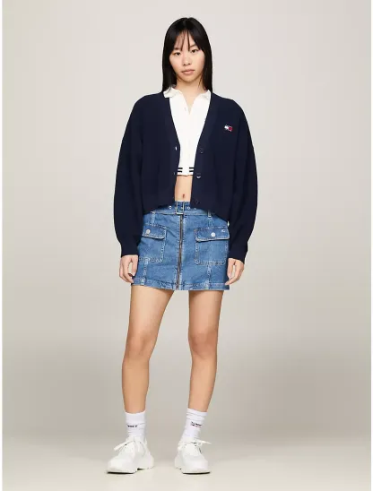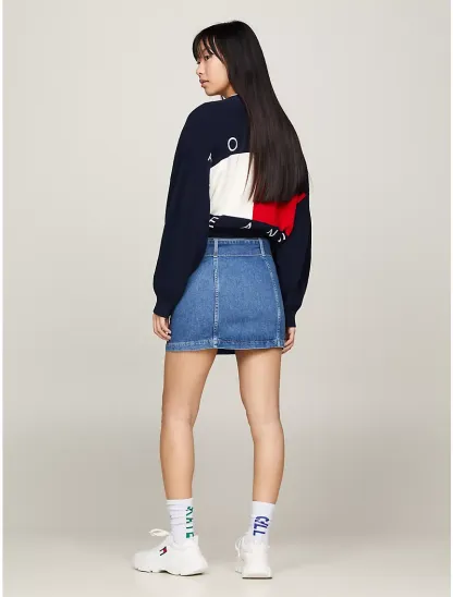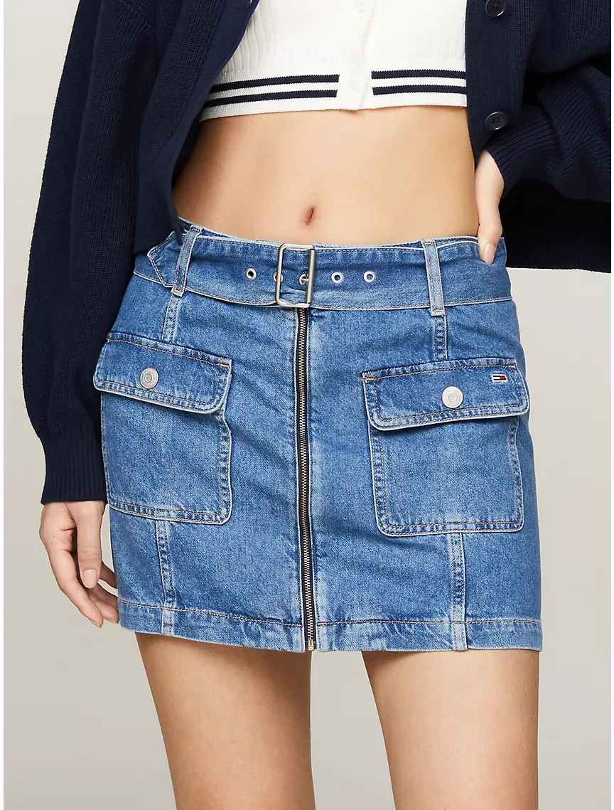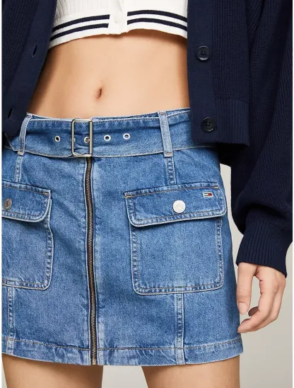 - Zip closure, belted waist, two front buttoned flap pockets, fading on seams, microflag at chest pocket, tottgmmy Jeans branding, mini length.