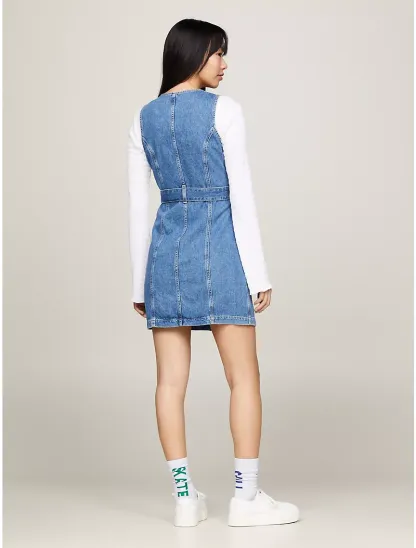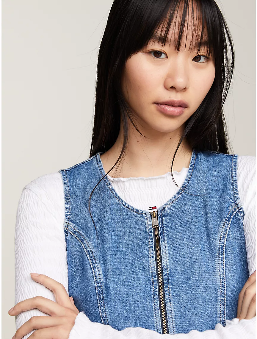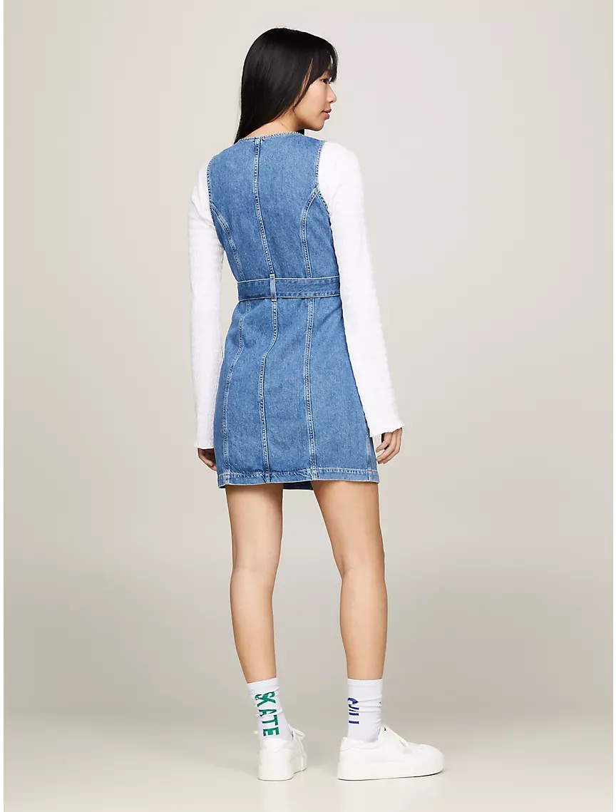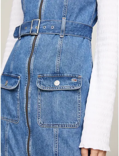 - Zip closure, rounded neckline, belted waist, two front patch pockets, microflag at pocket.