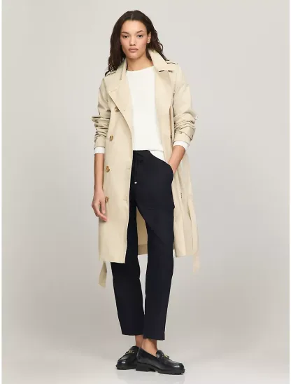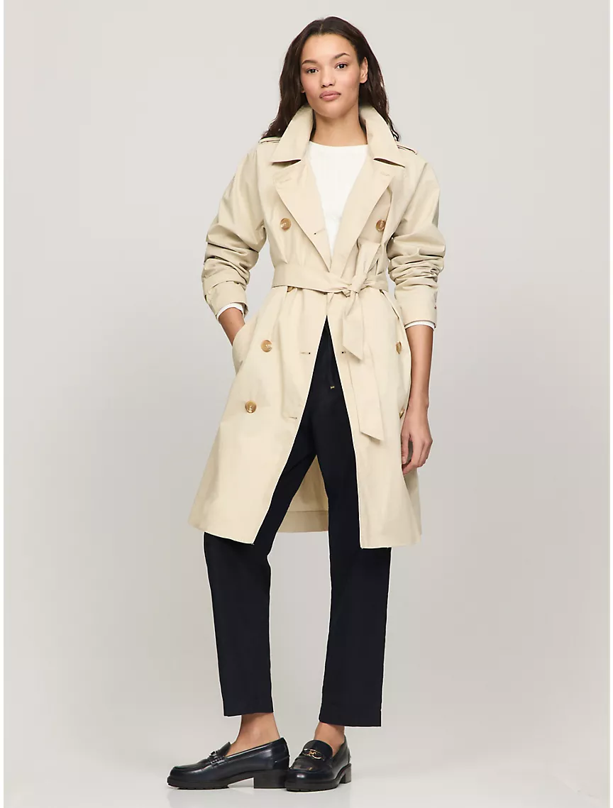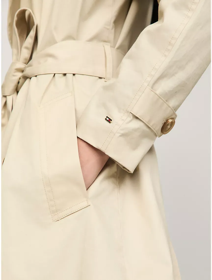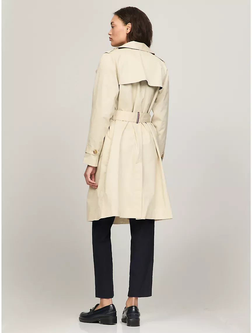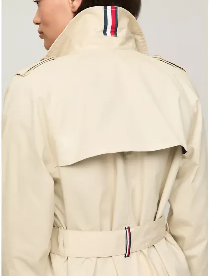 - Button closure, belted waist and cuffs, side pockets, shoulder epaulettes, single vent, storm flap, partial lining.