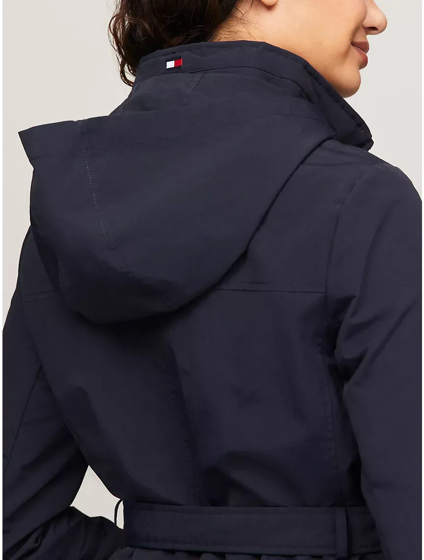 - Belted waist, zip pockets, mesh lining, hidden hood with Velcro closure, embroidered logo.