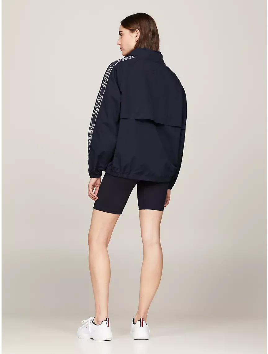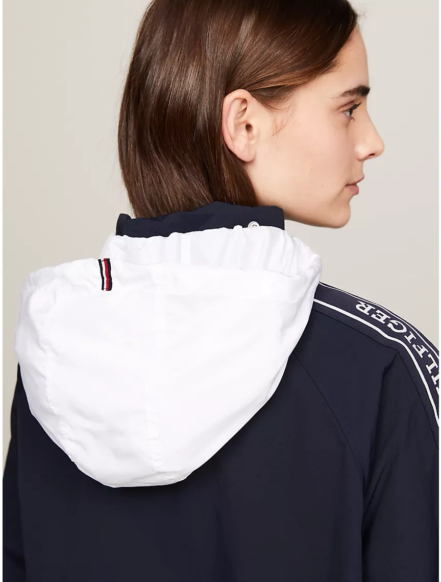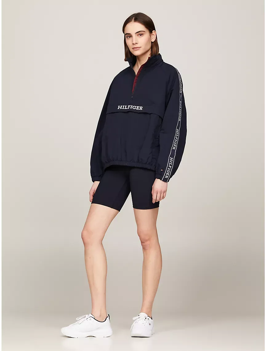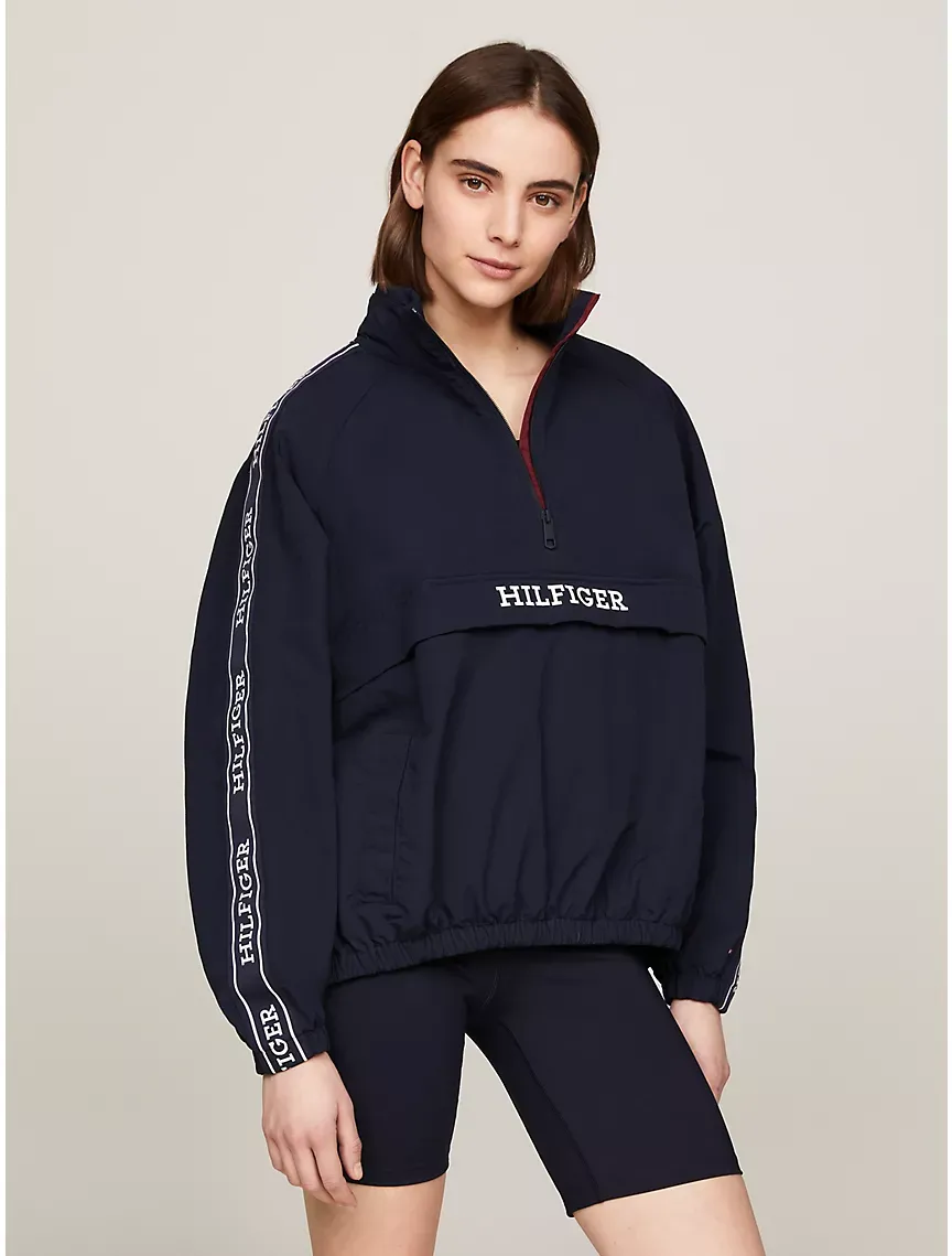 - Half-zip closure, stand-up collar, storm flaps at front and back, raglan sleeves, monotype logo, elastic cuffs and hem, drawstring hood.