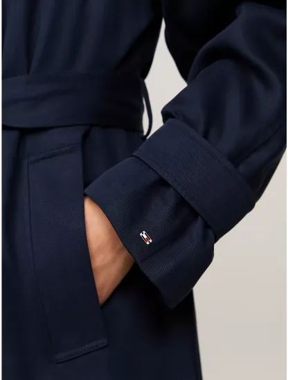 - Button closure, self belt, two front welt pockets, raglan sleeves, belted cuffs, storm flap.