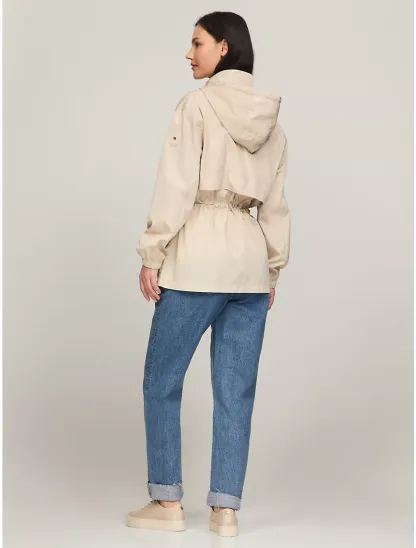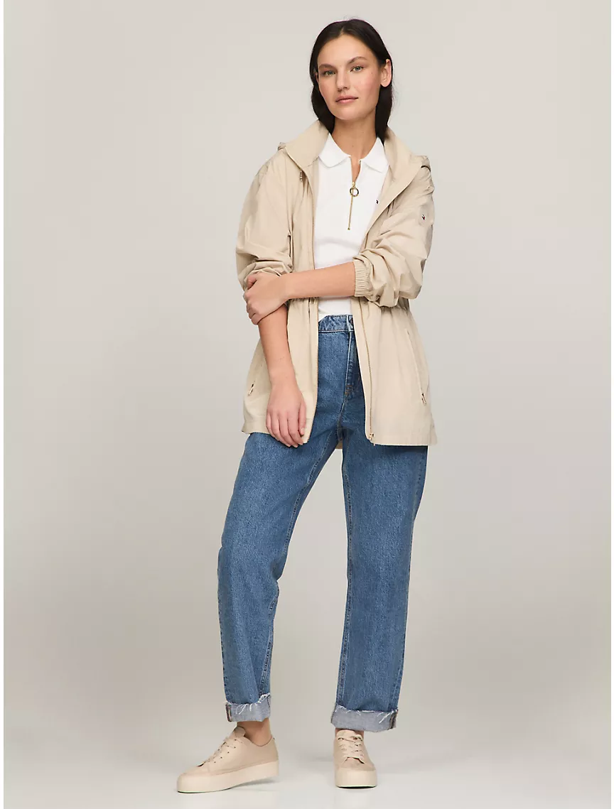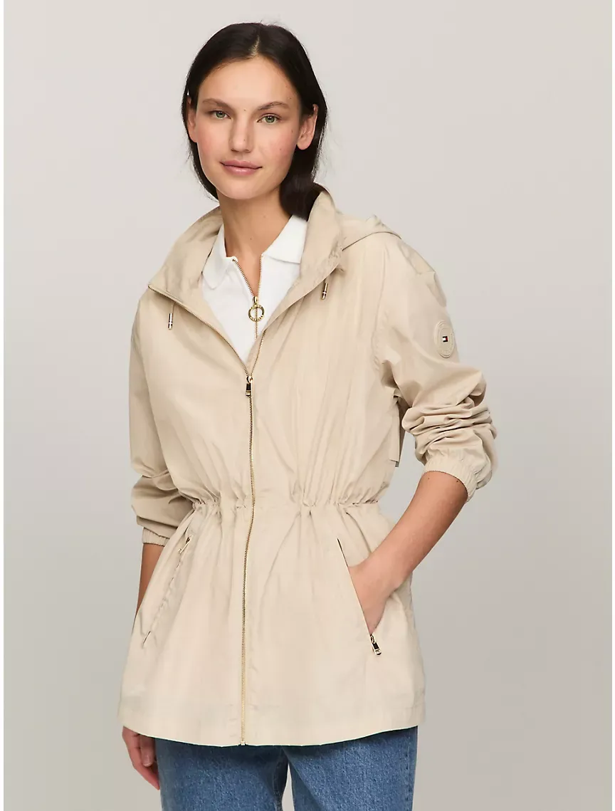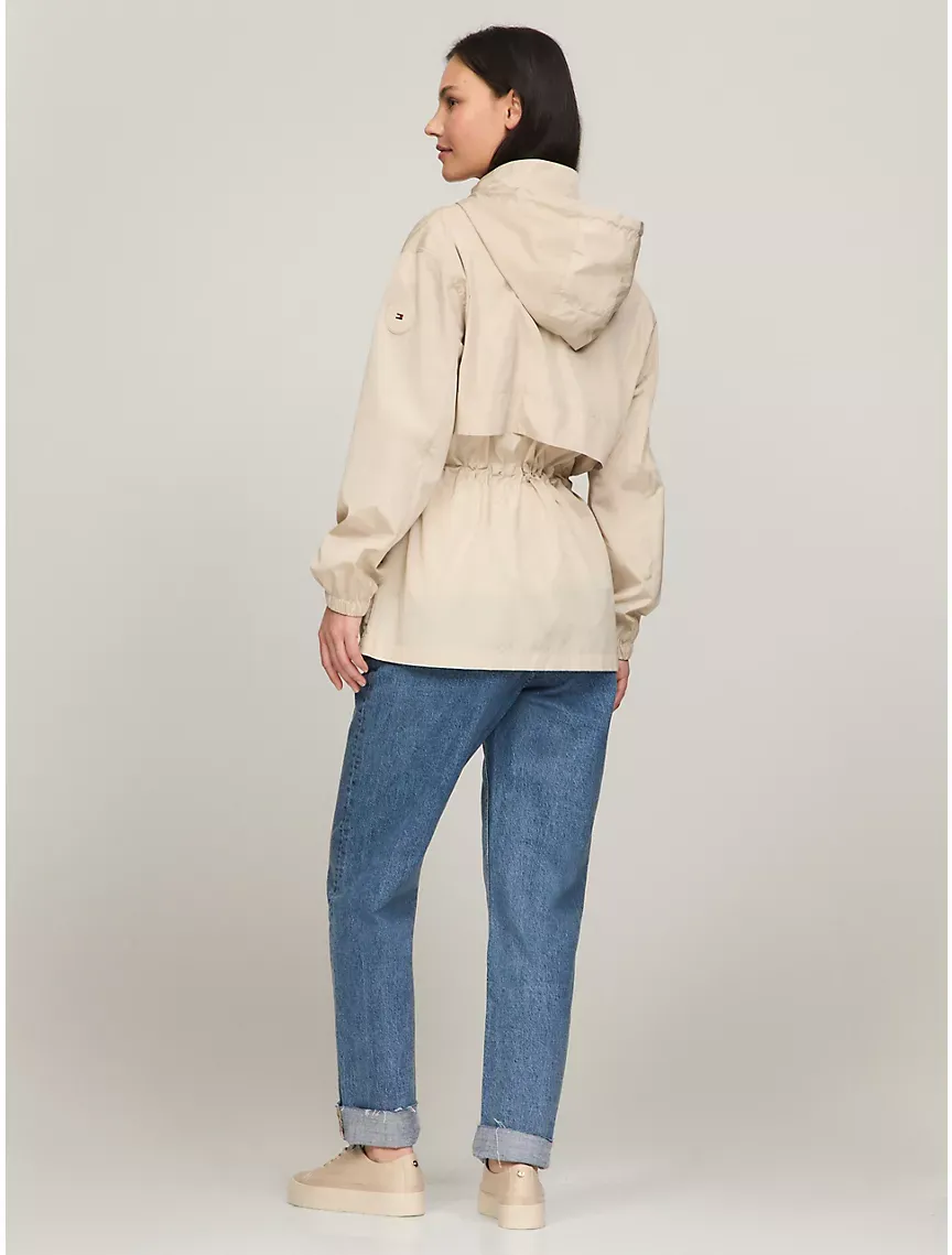 - Zip closure, drawstring hood, internal tunnel drawcord belt, elastic cuffs, side pockets.