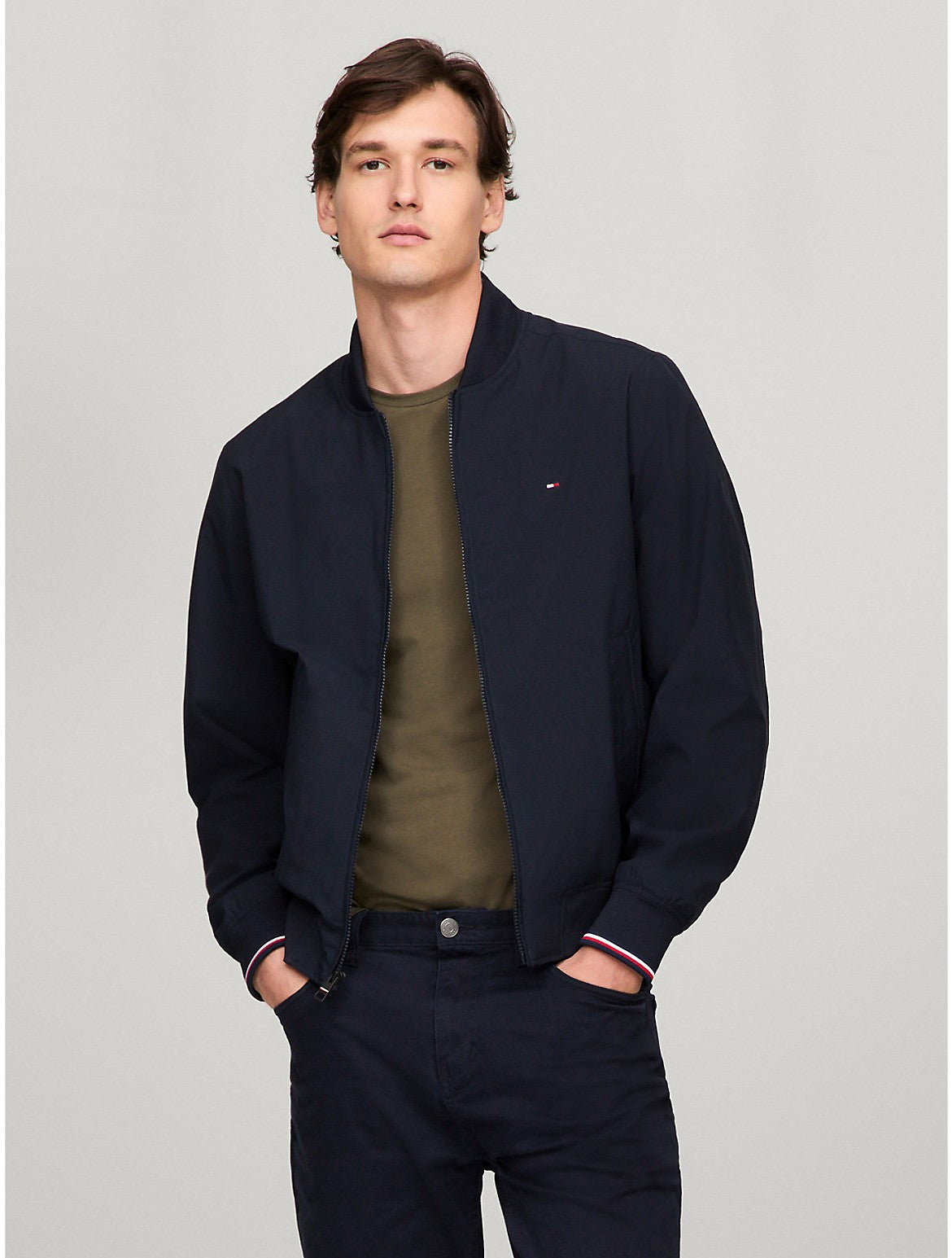 Tommy Hilfiger men's jacket. Our water-resistant jacket blends form and function in classic Tommy style. Designed to be light, super versatile, and ready to take on whatever Mother Nature throws at you. Material - 63% Recycled Polyester, 37% Thermoplastic Polyurethane.