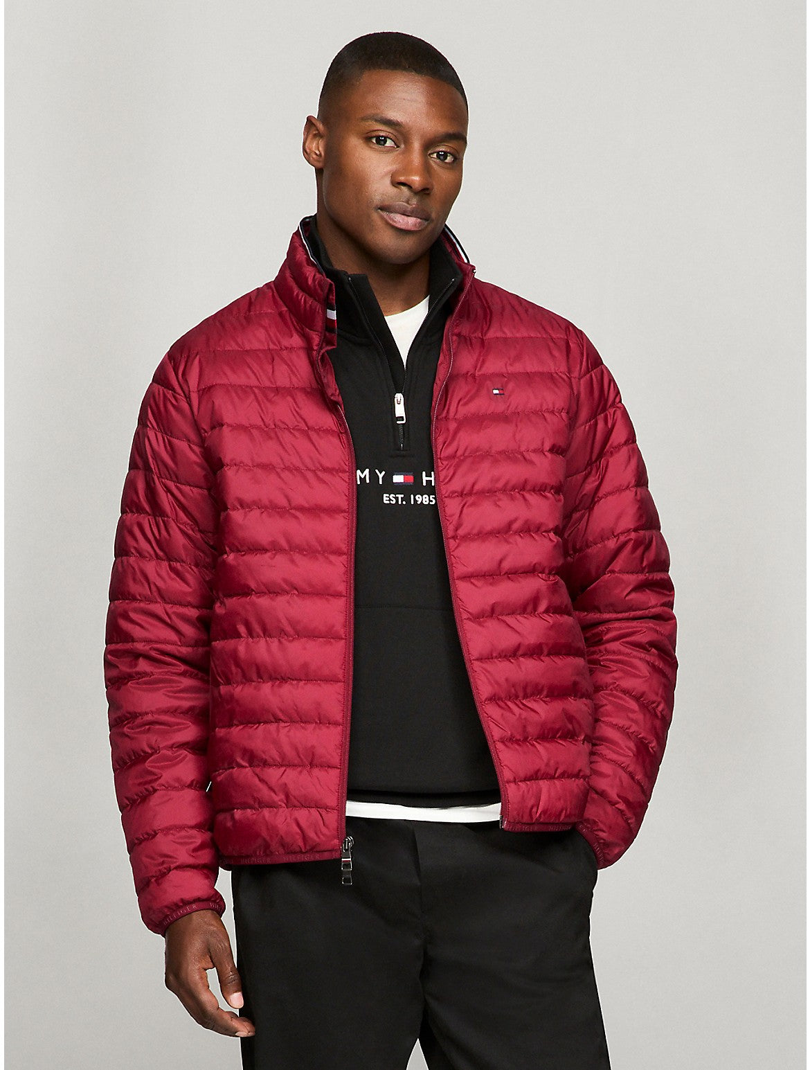 Tommy Hilfiger men's jacket. Ideal for travel, this puffer jacket packs down to a fraction of its size. Cut from lightweight fabric and strategically insulated, it's ready for whatever the weather report is dishing out. Material - 100% Reprocessed Polyester.