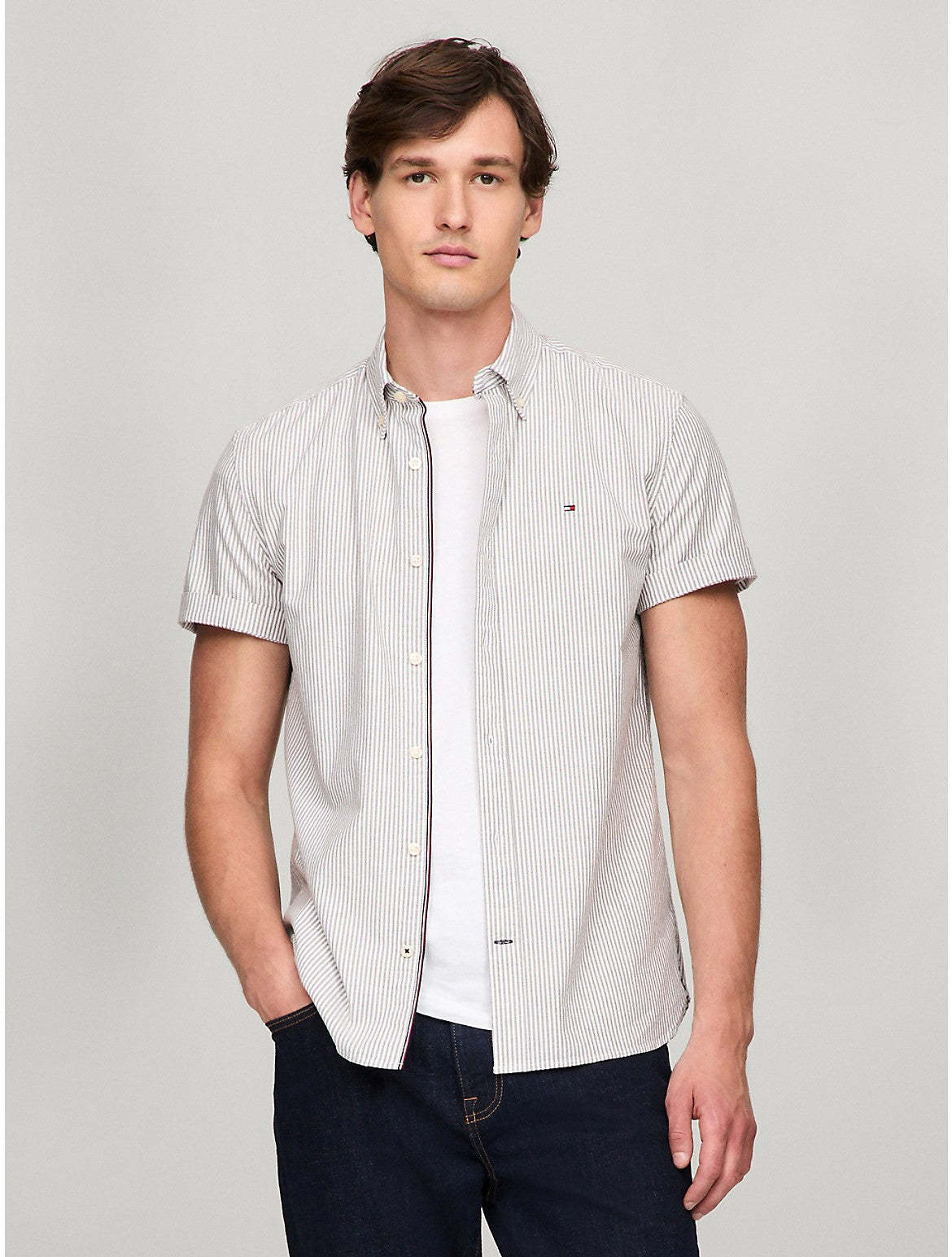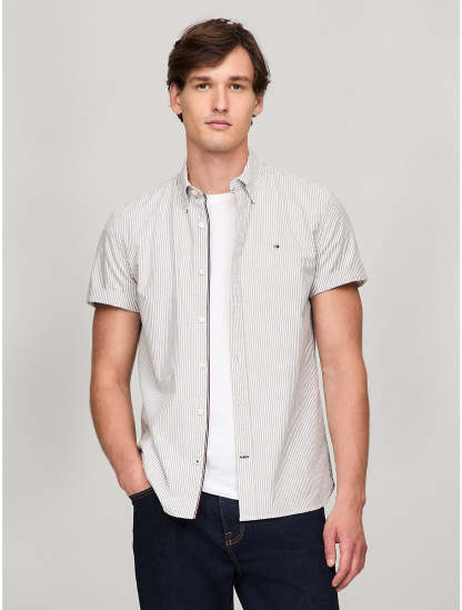 Tommy Hilfiger men's shirt. Embrace classic, easy-going style with this short-sleeve Oxford shirt, distinguished by its stripe print and subtle Tommy Hilfiger branding. Material - 98% Organic Cotton, 2% Elastane.