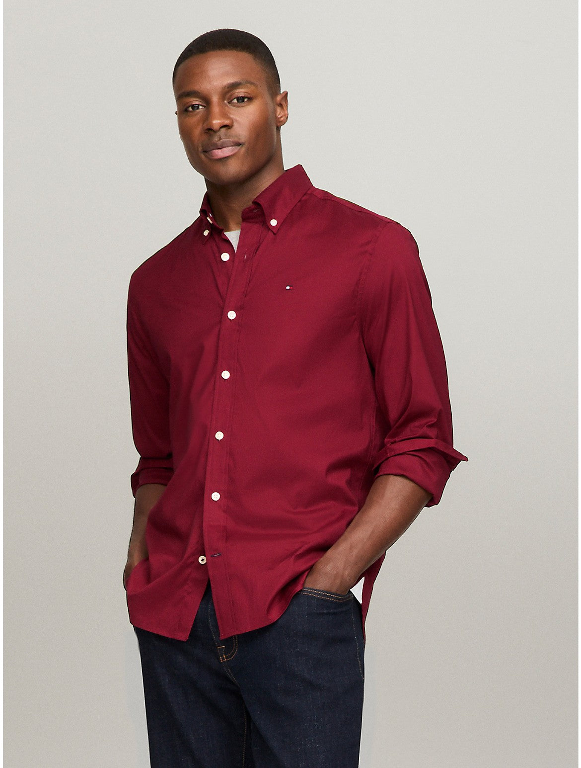 Tommy Hilfiger men's shirt. Our cotton poplin shirt has the crisp texture you expect, softened with an enzyme wash for a subtly smoother feel and looser drape. This version pairs well with chinos, jeans, and even shorts鈥攎aking it an easy go-to for the office and beyond. Material - 98% Better Cotton Initiative, 2% Elastane.
