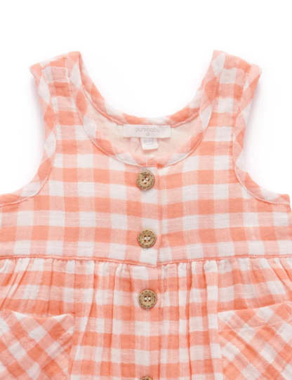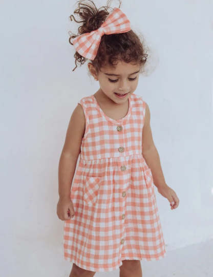 Our pretty Papaya Gingham Pinnie is a sweet style for your little one. Featuring a bright gingham pattern, gathered skirt and front pockets. Made from our GOTS certified 100% Organic Cotton muslin for a soft and breathable summer dress. Layer with a tee for cooler weather, or wear on its own on hot days. Style with our matching Gingham Bow Hairclip for a fun accessory.