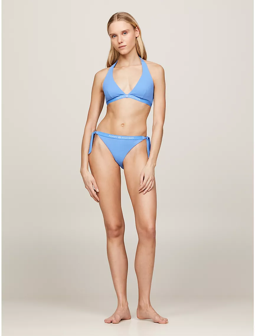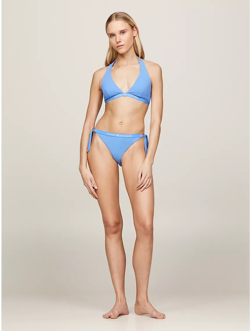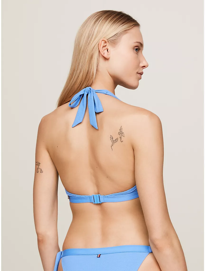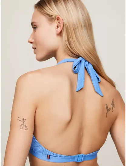 - Self-tie halter neck, clip fastening at back, removable padding.