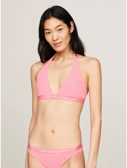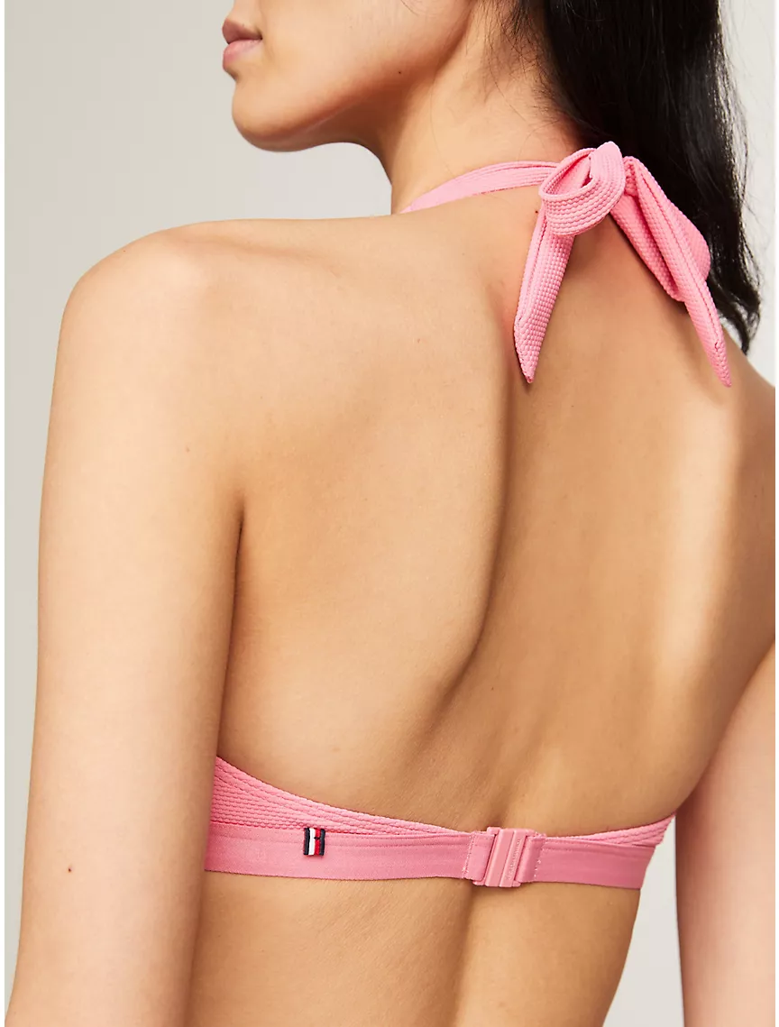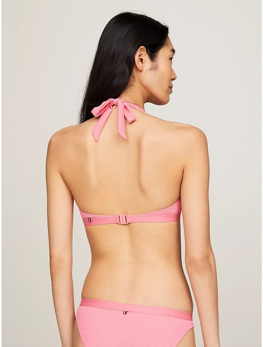 - Self-tie halter neck, clip fastening at back, removable padding.