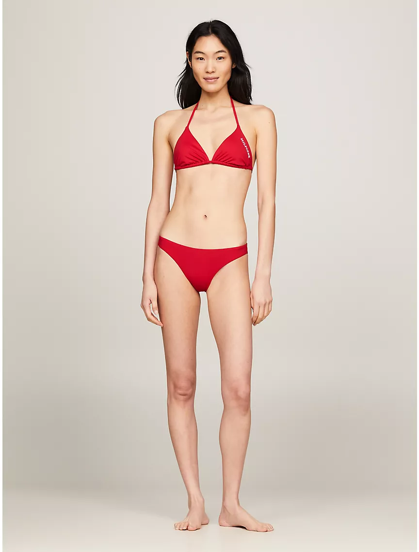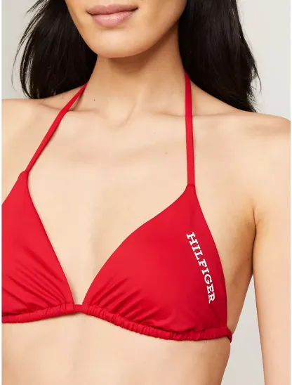 - Halter neck, self-tie straps at neck and back, triangle cups, removable padding.