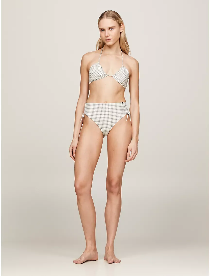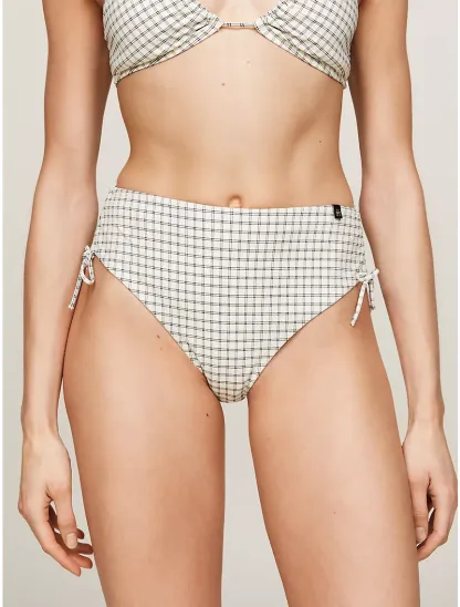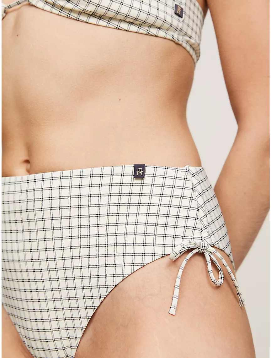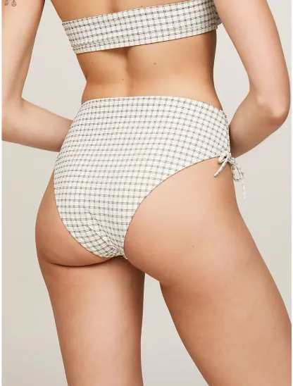 - Tie detail at sides, cheeky silhouette, high-rise waist, high-cut leg.