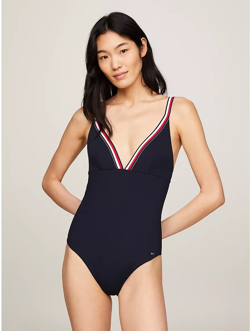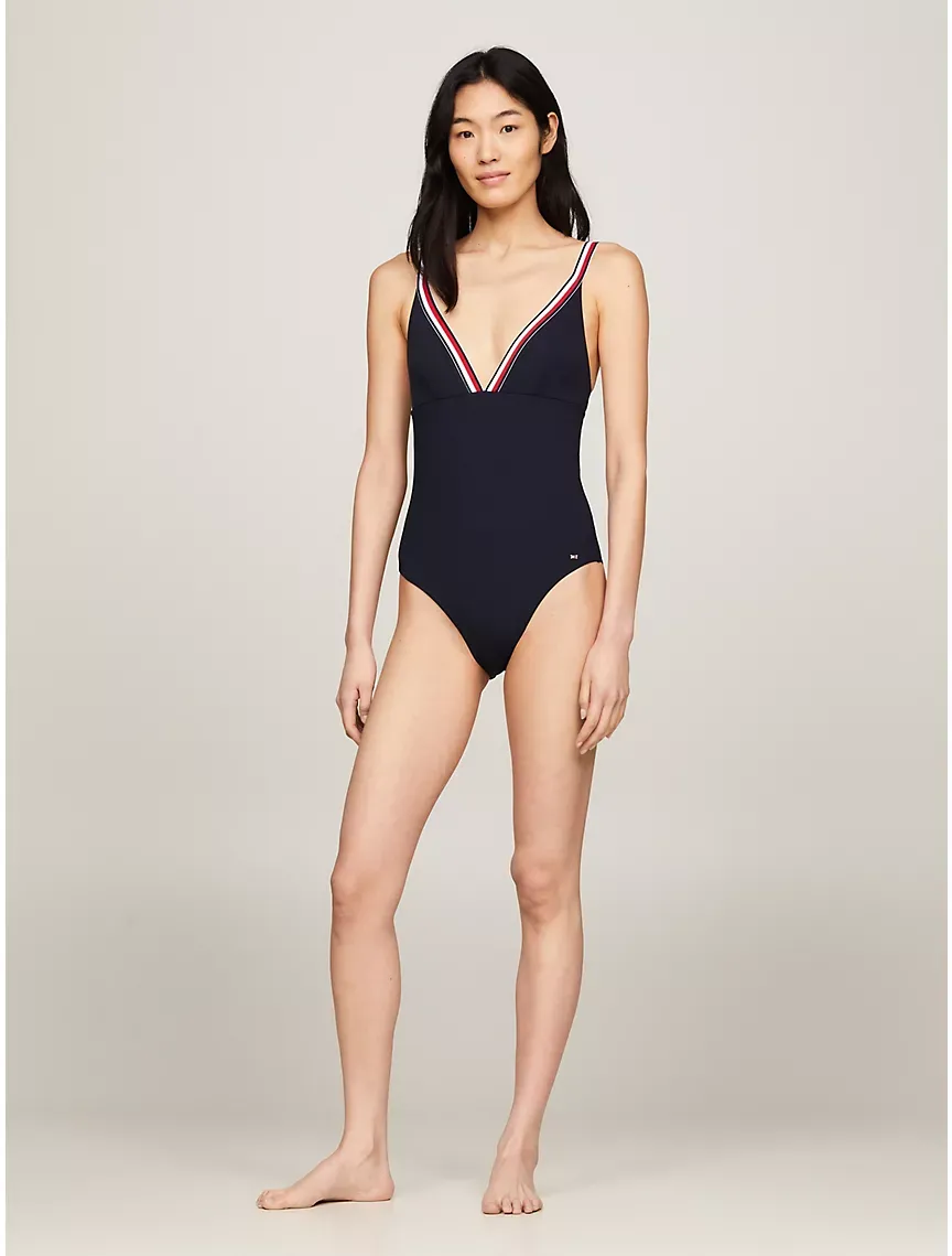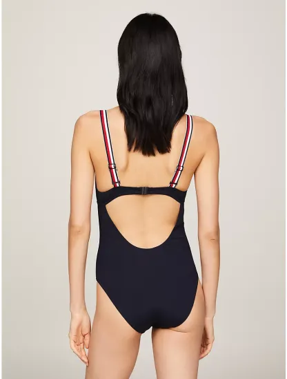 - Adjustable straps, clip fastening at back, removable padding, scoop back, high-cut leg.