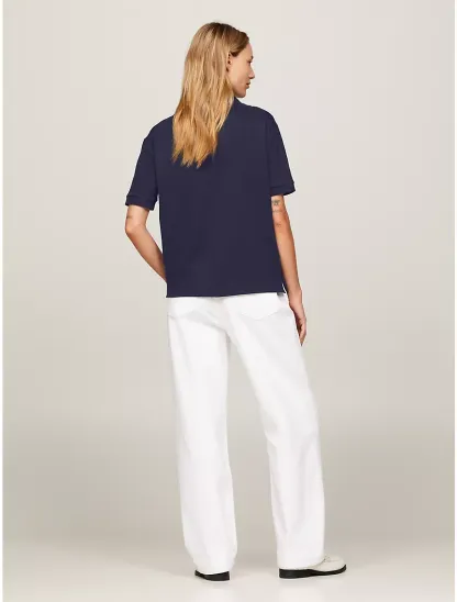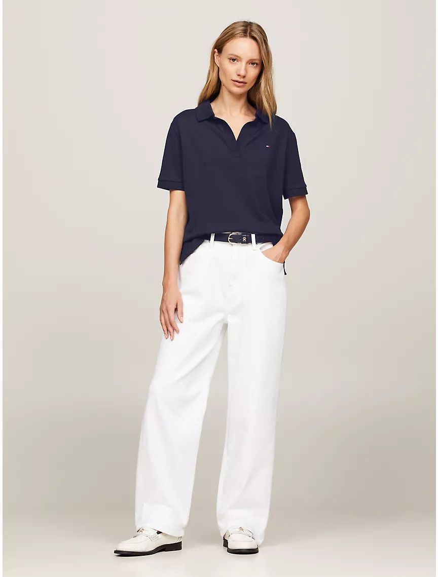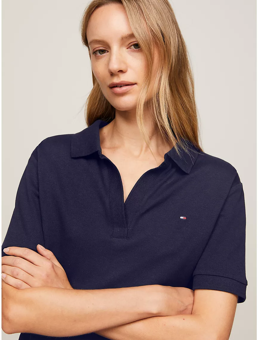 - Open placket, polo collar, contrast collar and cuffs, microflag at chest.