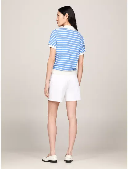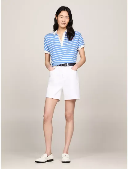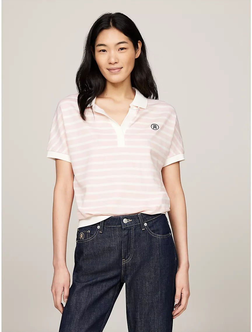 - Open placket, polo collar, contrast collar and cuffs, embroidered TH monogram at chest.