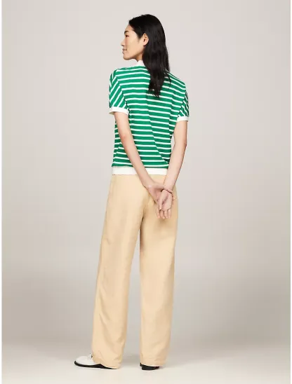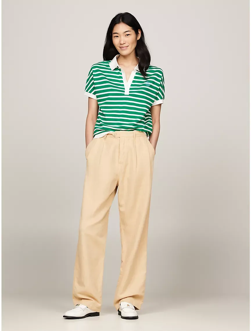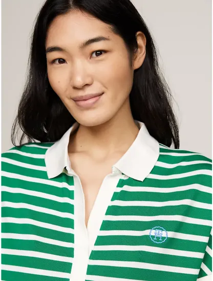 - Open placket, polo collar, contrast collar and cuffs, embroidered TH monogram at chest.