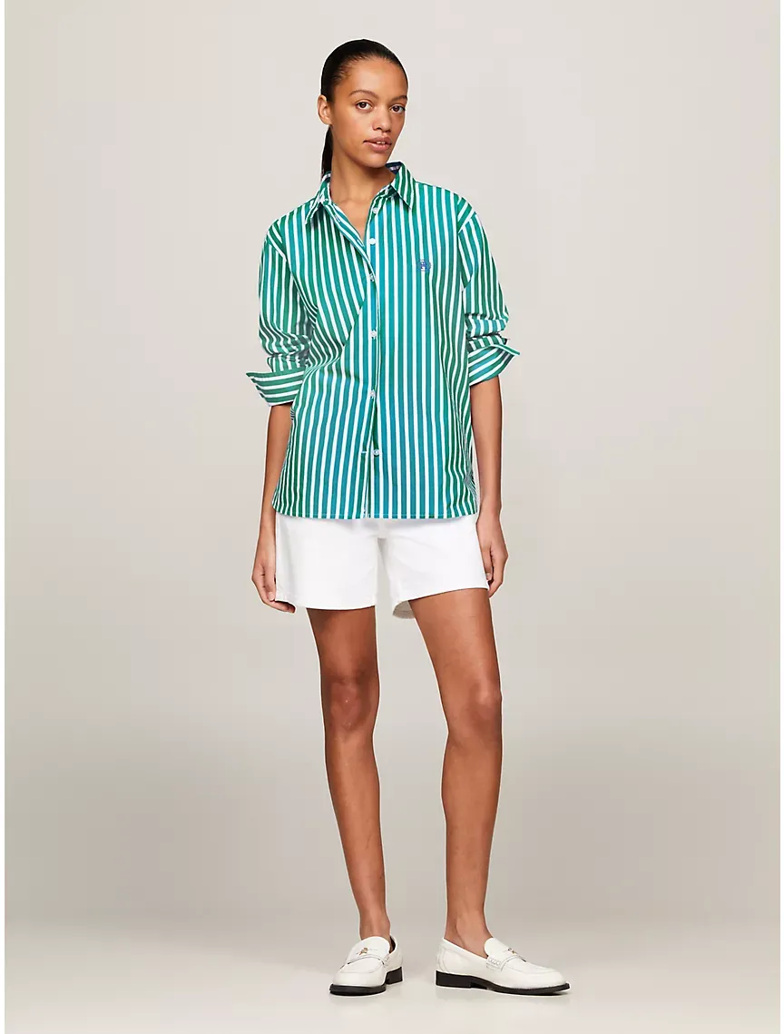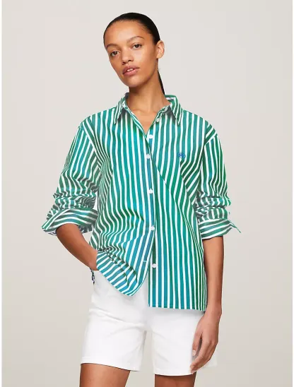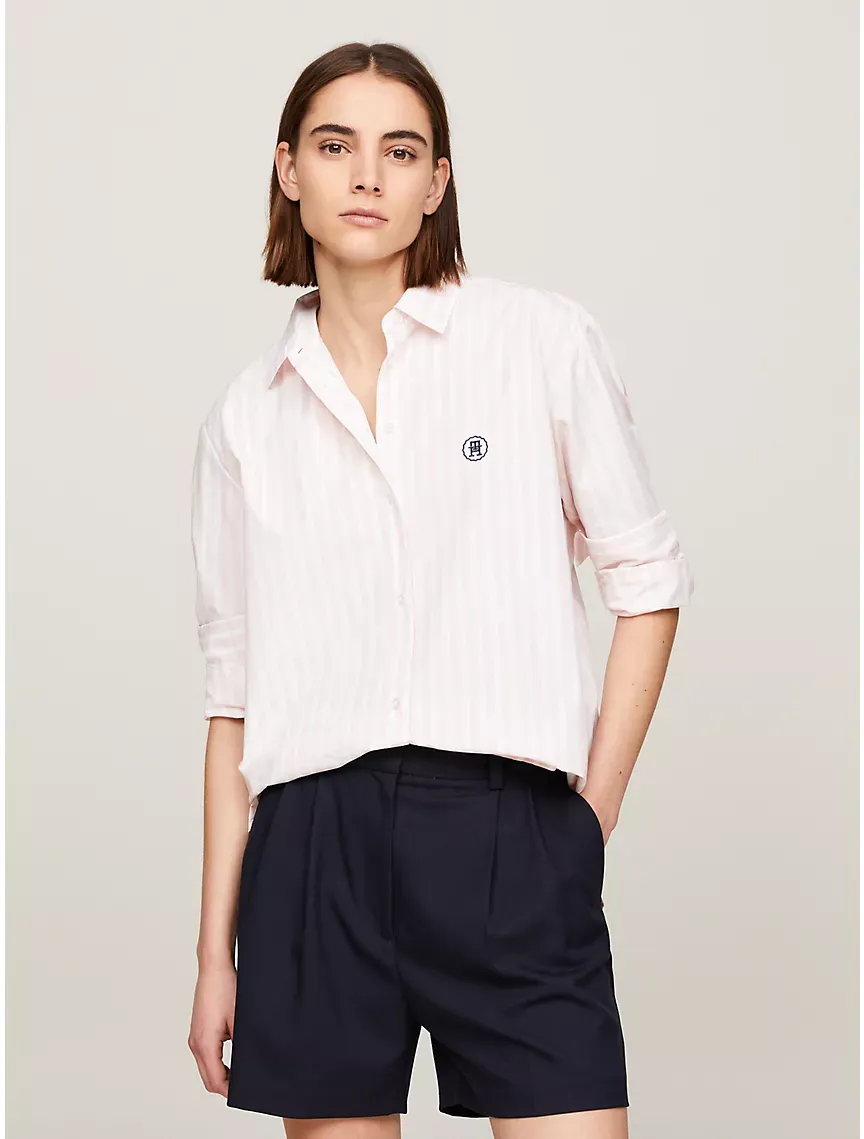 - Button closure, single-button cuffs, semi-spread collar, TH monogram embroidered logo, microflag at sleeve.