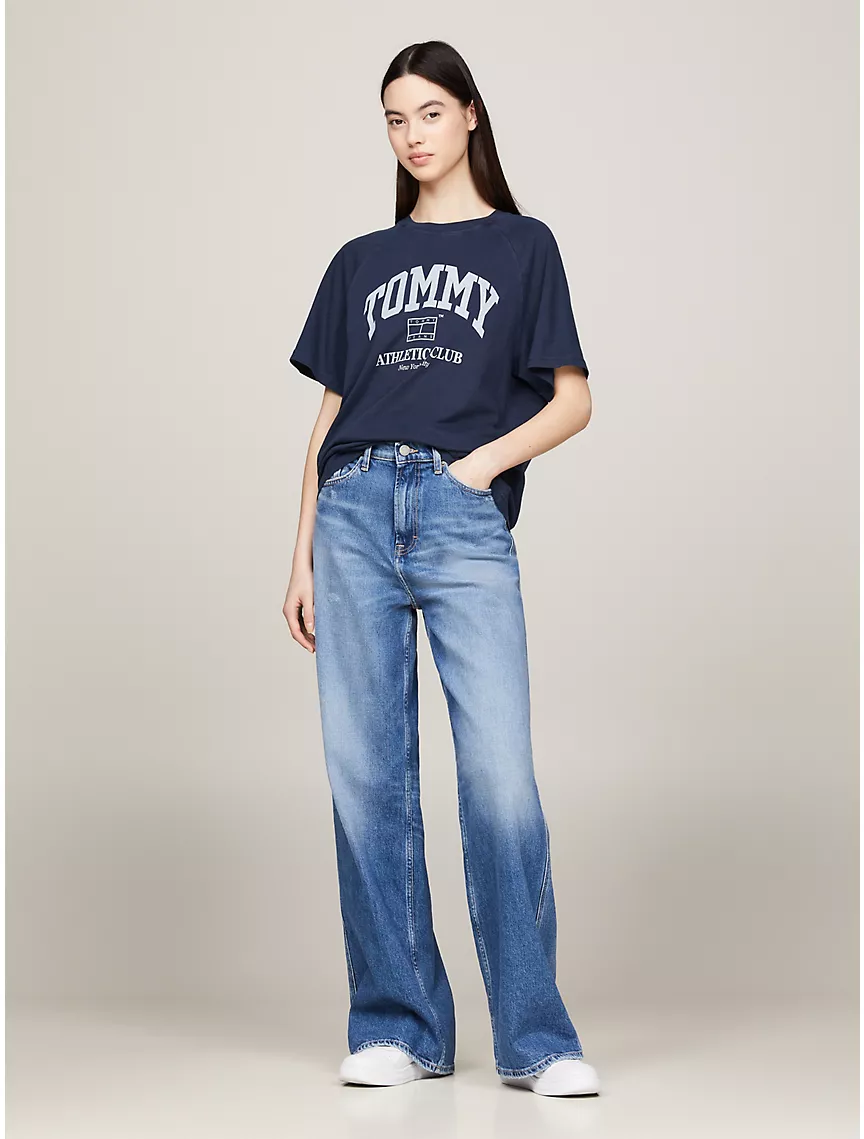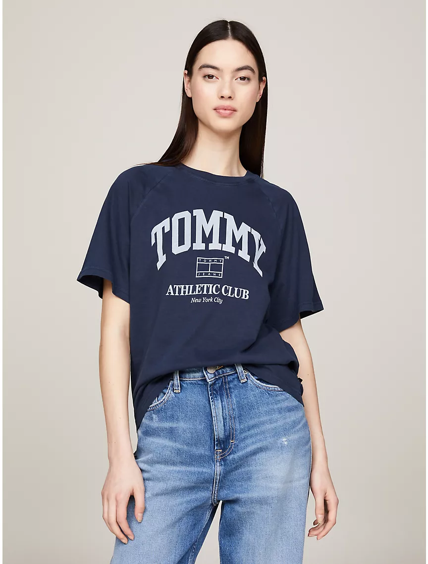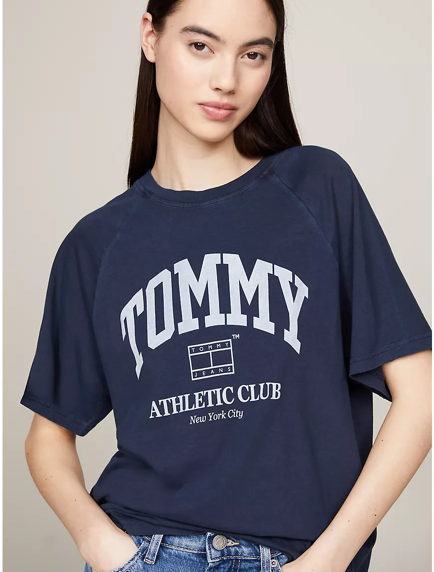 - Crewneck, raglan sleeves, tottgmmy Jeans NYC varsity logo at chest.