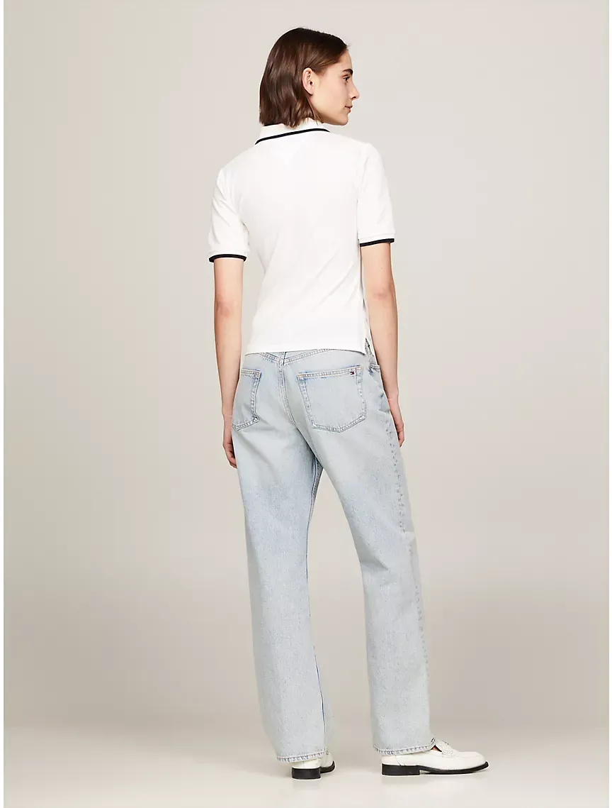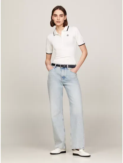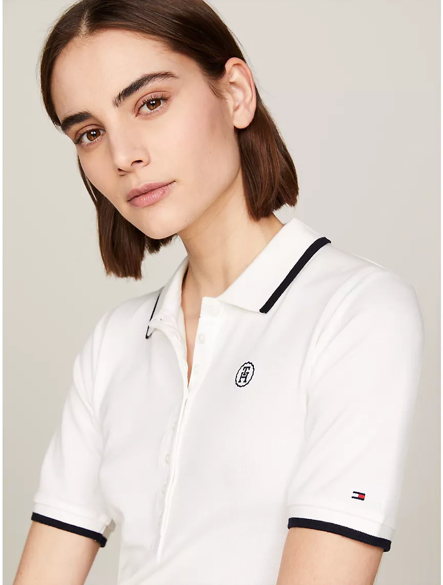 - 8-button placket, tipped polo collar and cuffs, embroidered TH monogram at chest.