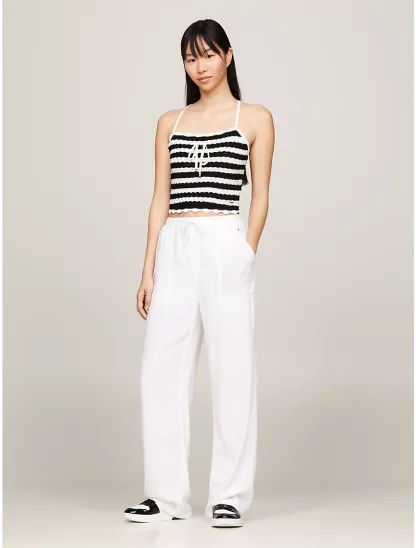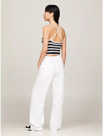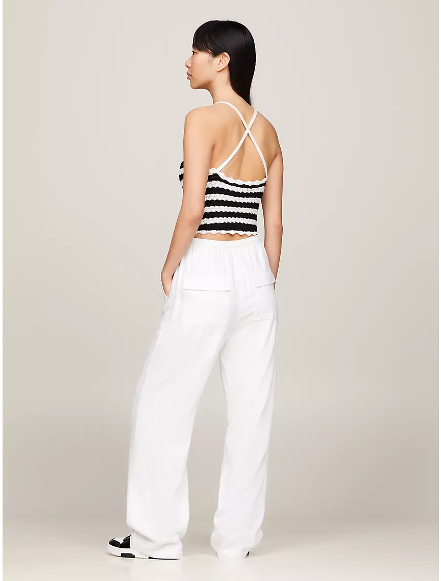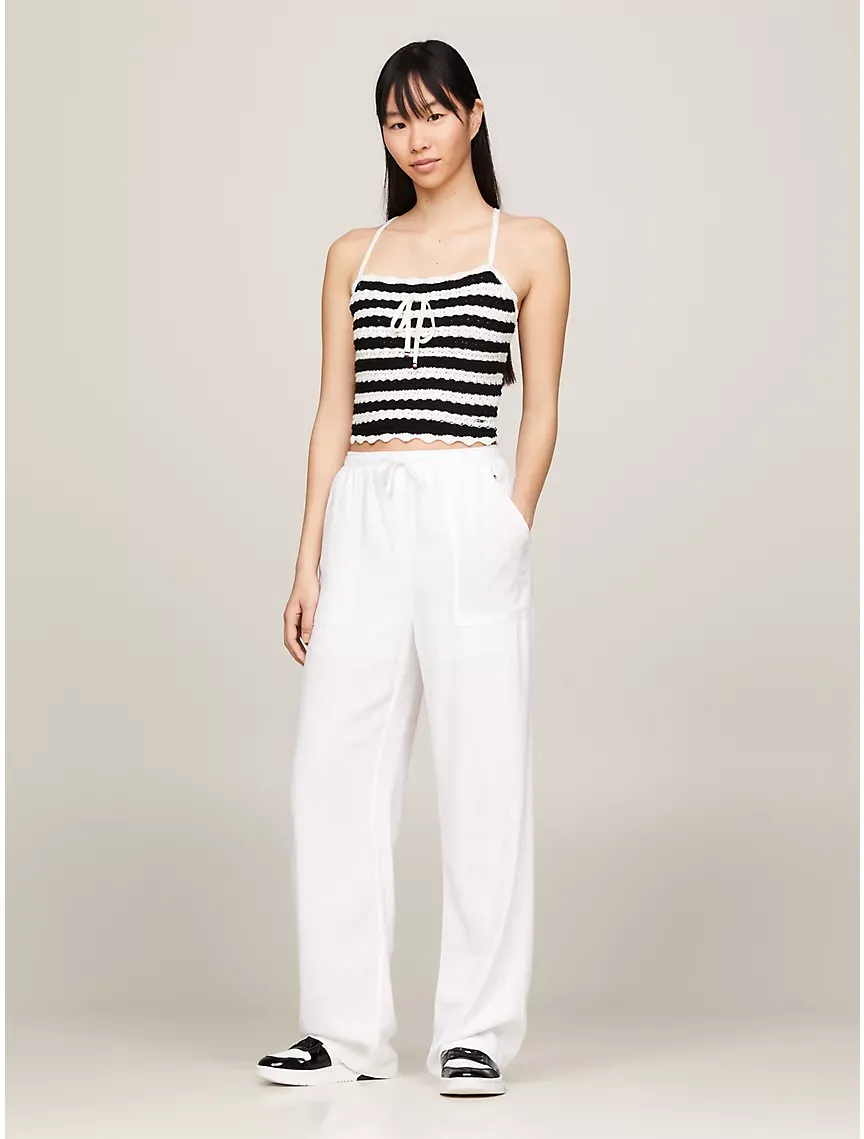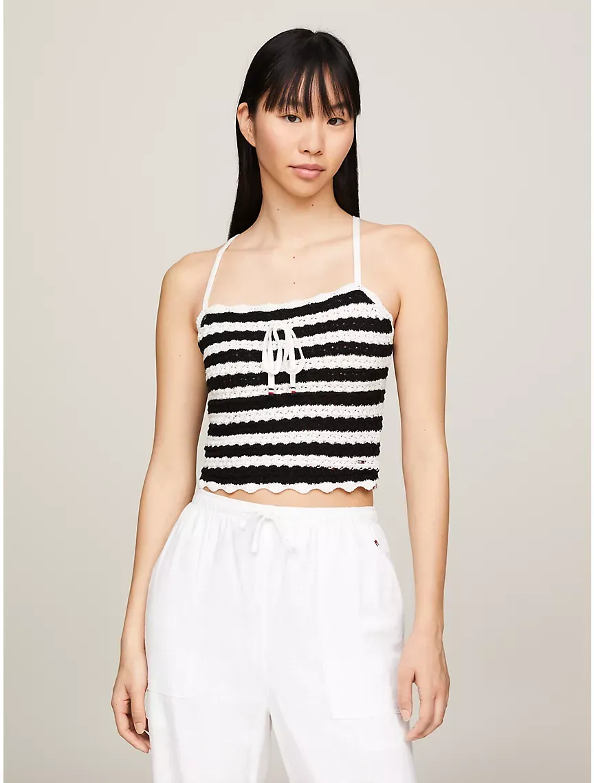 - Square neckline, scalloped trim, crossover straps at back, bow detail at front, tottgmmy Jeans microflag at hem.