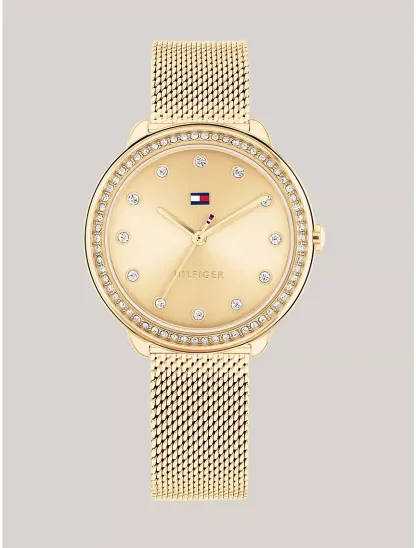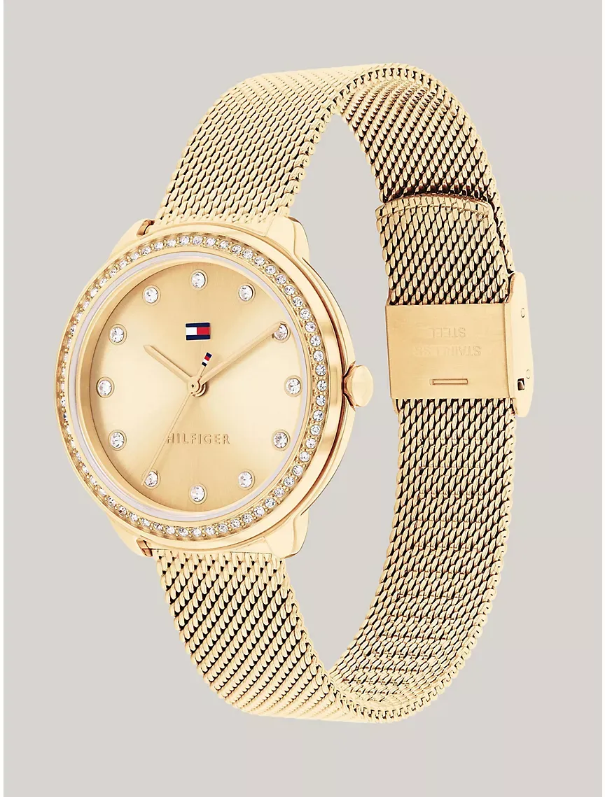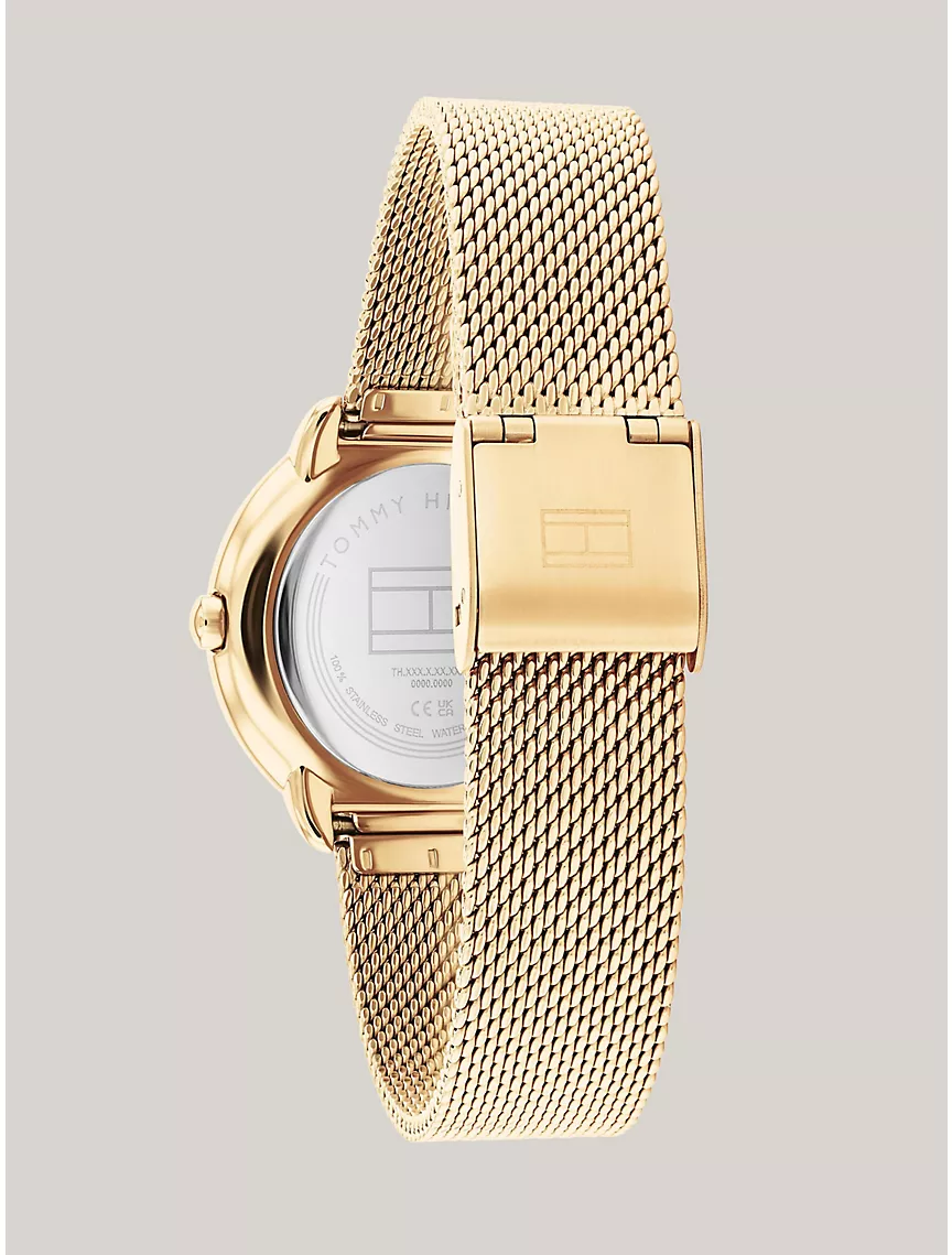 - 32mm gold-plated stainless steel case, gold-tone dial, gold-plated stainless steel mesh bracelet, three-hand movement.
